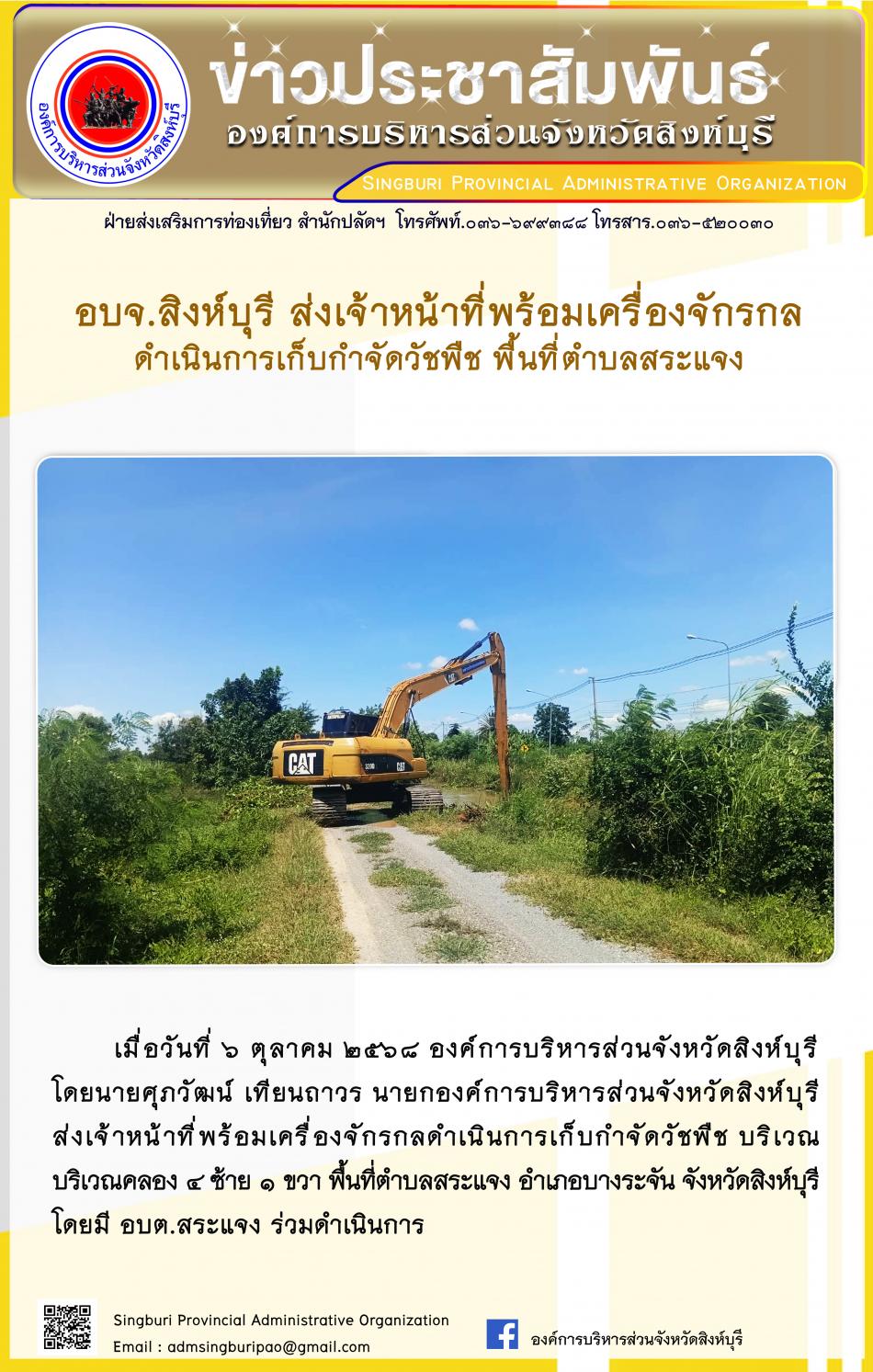 อบจ.สิงห์บุรี ส่งเจ้าหน้าที่พร้อมเครื่องจักรกล ดำเนินการเก็บกำจัดวัชพืช พื้นที่ตำบลสระแจง [6 ตุลาคม 2568]