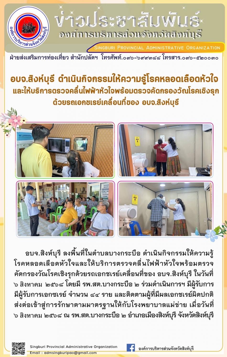 อบจ.สิงห์บุรี ดำเนินกิจกรรมให้ความรู้โรคหลอดเลือดหัวใจและให้บริการตรวอคลื่นไฟฟ้าหัวใจพร้อมตรวจคัดกรองวัณโรดเชิงรุก ด้วยรถเอกซเรย์เคลื่อนที่ของ อบจ.สิงห์บุรี [6 ตุลาคม 2568]