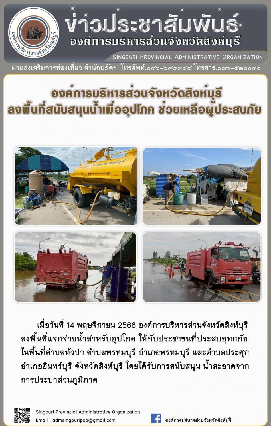 องค์การบริหารส่วนจังหวัดสิงห์บุรี ลงพื้นที่สนับสนุนน้ำเพื่ออุปโภค ช่วยเหลือผู้ประสบภัย [14 พฤศจิกายน 2568]
