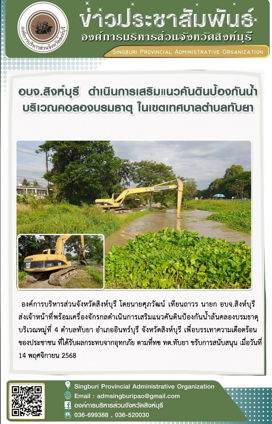 อบจ.สิงห์บุรี ดำเนินการเสริมแนวคันดิน ป้องกันน้ำ บริเวณคลองบรมธาตุ ในเขตเทศบาลตำบลทับยา [14 พฤศจิกายน 2568]