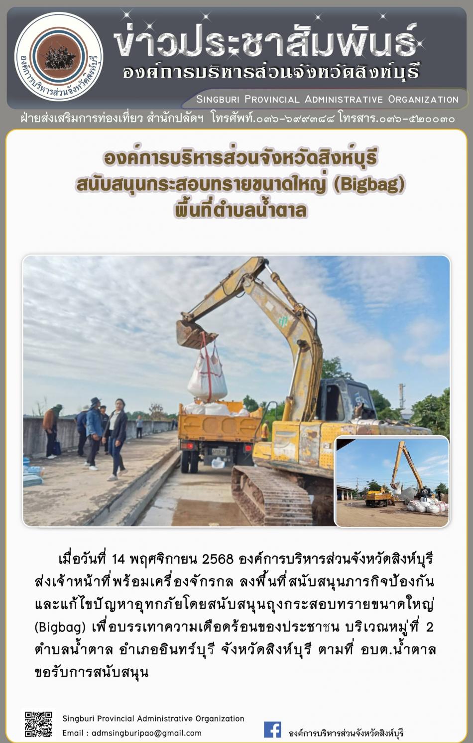 องค์การบริหารส่วนจังหวัดสิงห์บุรี สนับสนุนกระสอบทรายขนาดใหญ่ (bigbag) พื้นที่ตำบลน้ำตาล [14 พฤศจิกายน 2568]