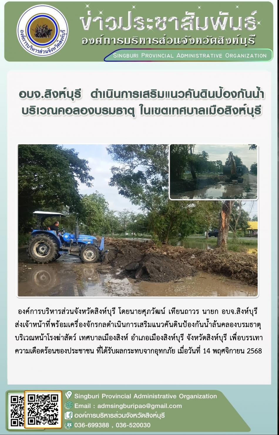 อบจ.สิงห์บุรี ดำเนินการ เสริมแนวคันดินป้องกันน้ำเสริมแนวคันดินป้องกันน้ำท่วม ในเขตเทศบาลเมืองสิงห์บุรี [14 พฤศจิกายน 2568]