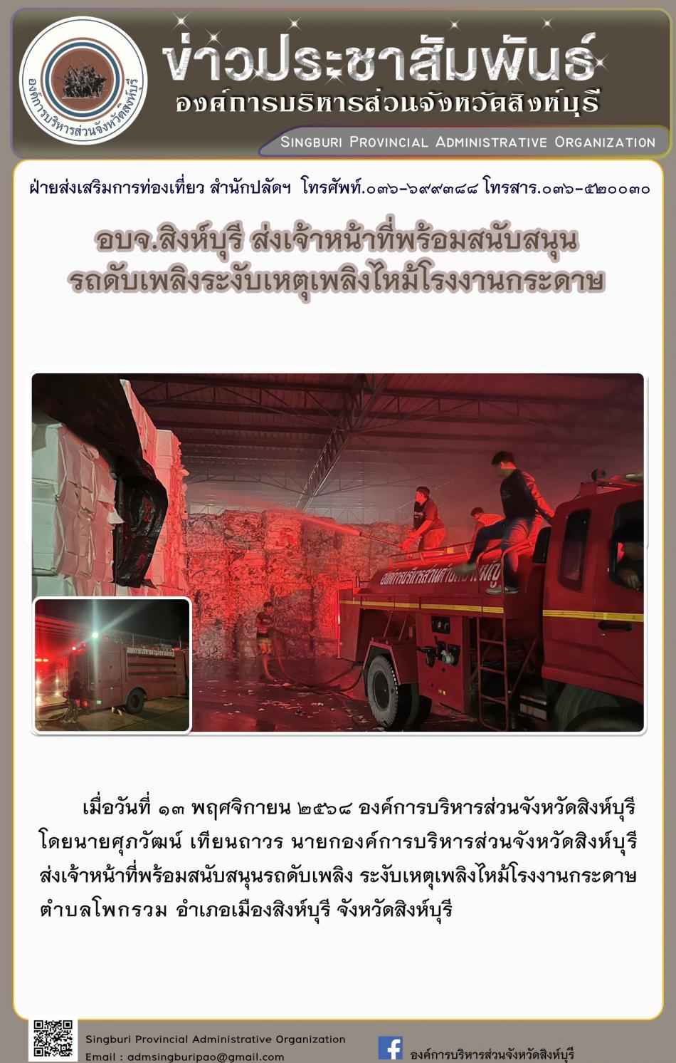 อบจ.สิงห์บุรี ส่งเจ้าหน้าที่พร้อมสนับสนุนรถดับเพลิงระงับเหตุเพลิงไหม้โรงงานกระดาษ [13 พฤศจิกายน 2568]