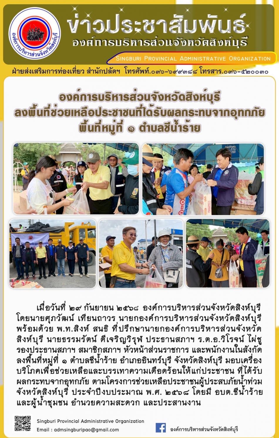 องค์การบริหารส่วนจังหวัดสิงห์บุรี ลงพื้นที่ช่วยเหลือประชาชนที่ได้รับผลกระทบจากอุทกภัย พื้นที่ตำบลชีน้ำร้าย [29 กันยายน 2568]