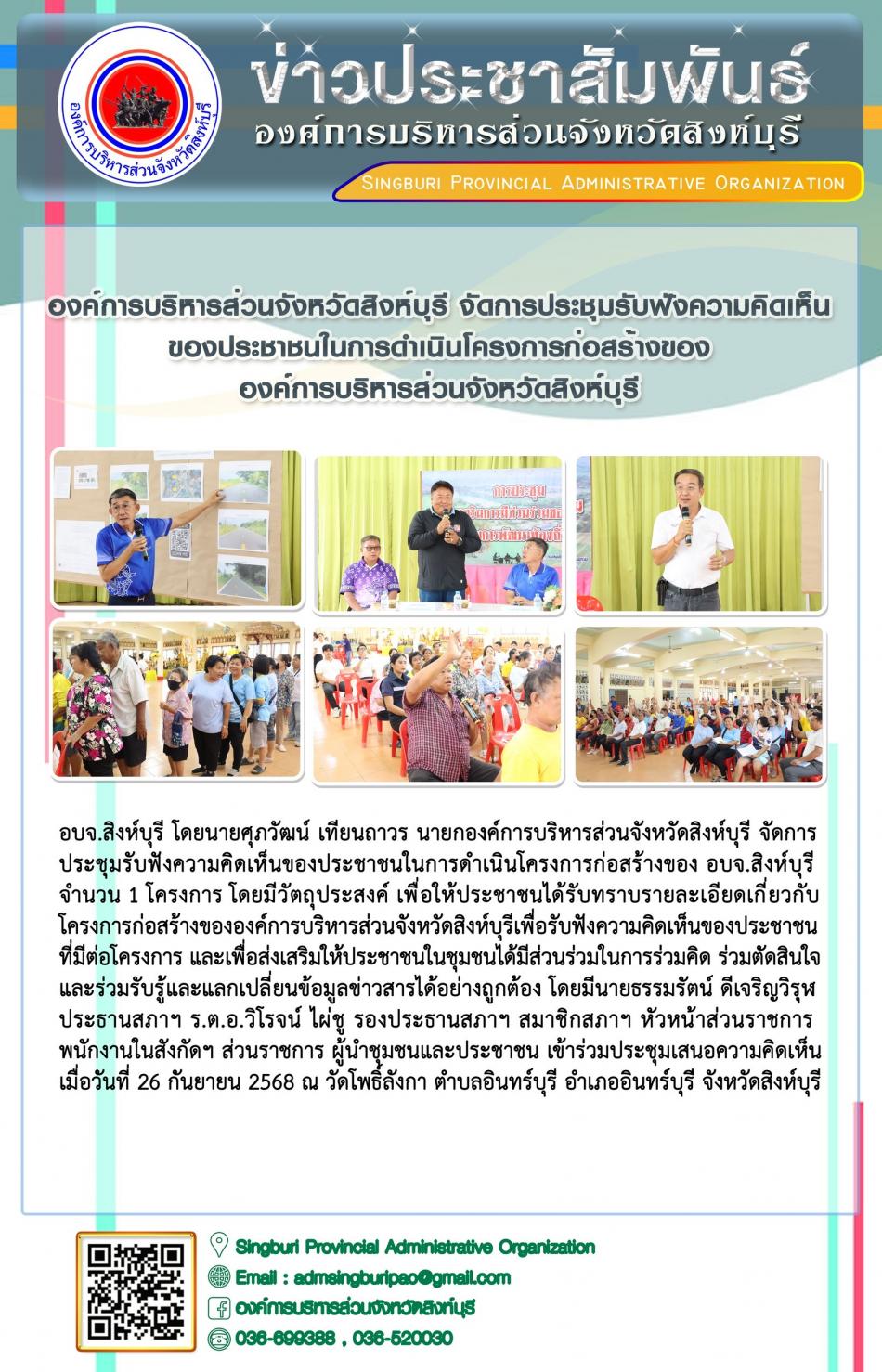 จัองการบริหารส่วนจังหวัดสิงห์บุรี จัดการประชุมรับฟังความคิดเห็นของประชาชนในการดำเนินโครงการก่อสร้างขององค์การบริหารส่วนจังหวัด [26 กันยายน 2568]