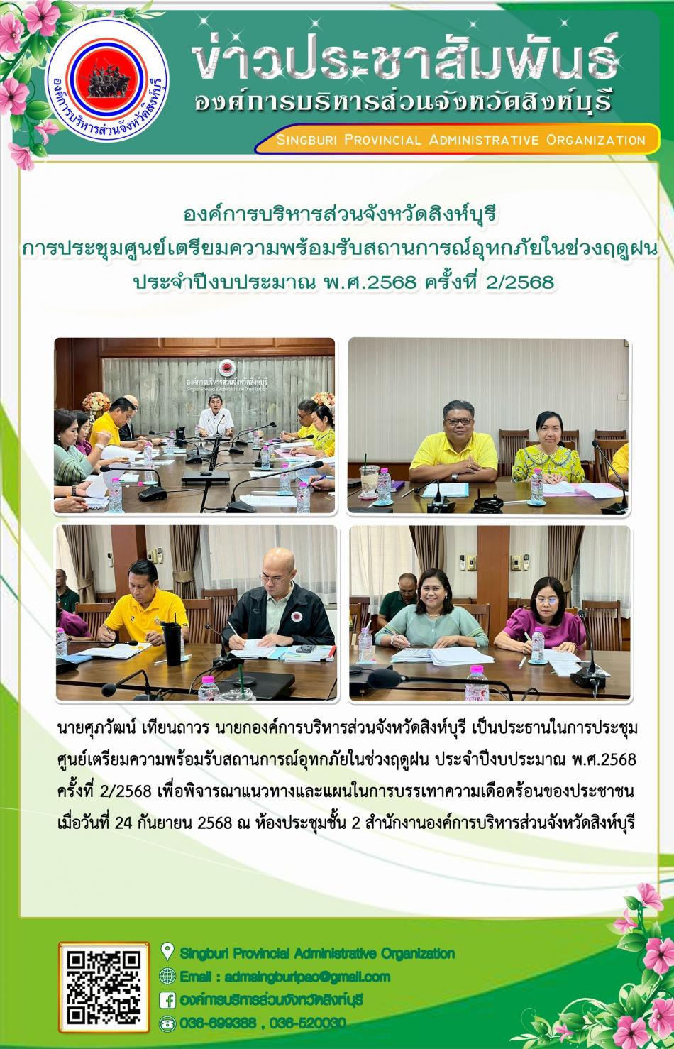 องค์การบริหารส่วนจังหวัดสิงห์บุรี ประชุมศูนย์เตรียมความพร้อมรับสถานการณ์อุทาภัยในช่วงฤดูฝน ประจำปีงบประมาณ พ.ศ.2568 ครั้งที่ 2/2568 [24 กันยายน 2568]