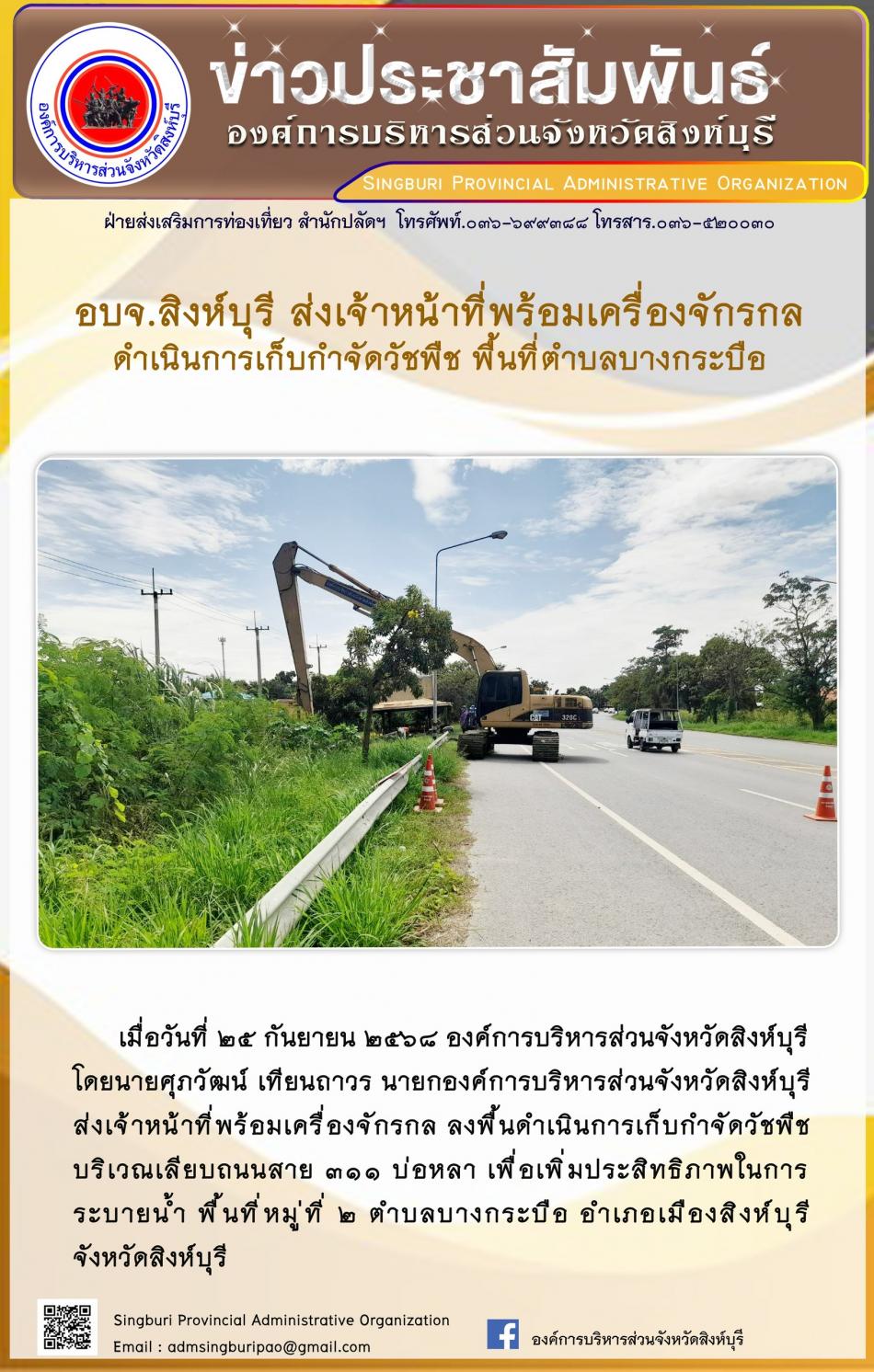 อบจ.สิงห์บุรี ส่งเจ้าหน้าที่พร้อมเครื่องจักรกล ดำเนินการเก็บกำจัดวัชพืช พื้นที่ตำบลบางกระบือ [25 กันยายน 2568]