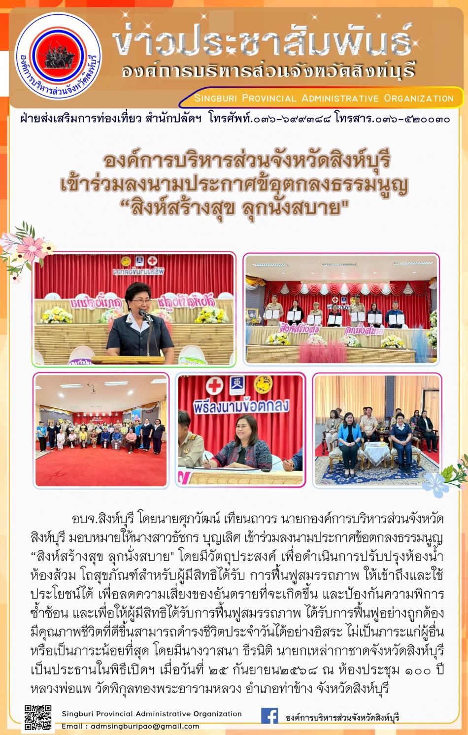 องค์การบริหารส่วนจังหวัดสิงห์บุรี เข้าร่วมลงนามประกาศข้อตกลงธรรมนูญ “สิงห์สร้างสุข ลุกนั่งสบาย” [25 กันยายน 2568]