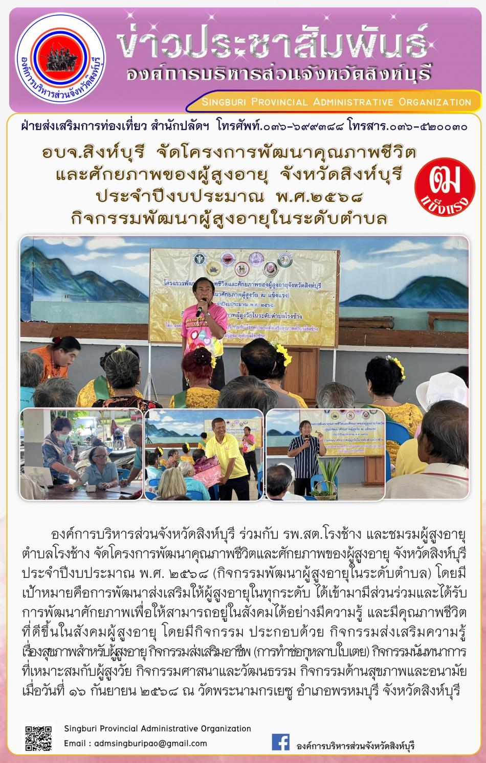 อบจ. สิงห์บุรี จัดโครงการพัฒนาคุณภาพชีวิตและศักยภาพของผู้สูงอายุ จังหวัด สิงห์บุรี ประจำประจำปีงบประมาณปี พ. ศ. 2568 กิจกรรมพัฒนาผู้สูงอายุในระดับตำบลกิจกรรมพัฒนาผู้สูงอายุในระดับตำบล [16 กันยายน 2568]