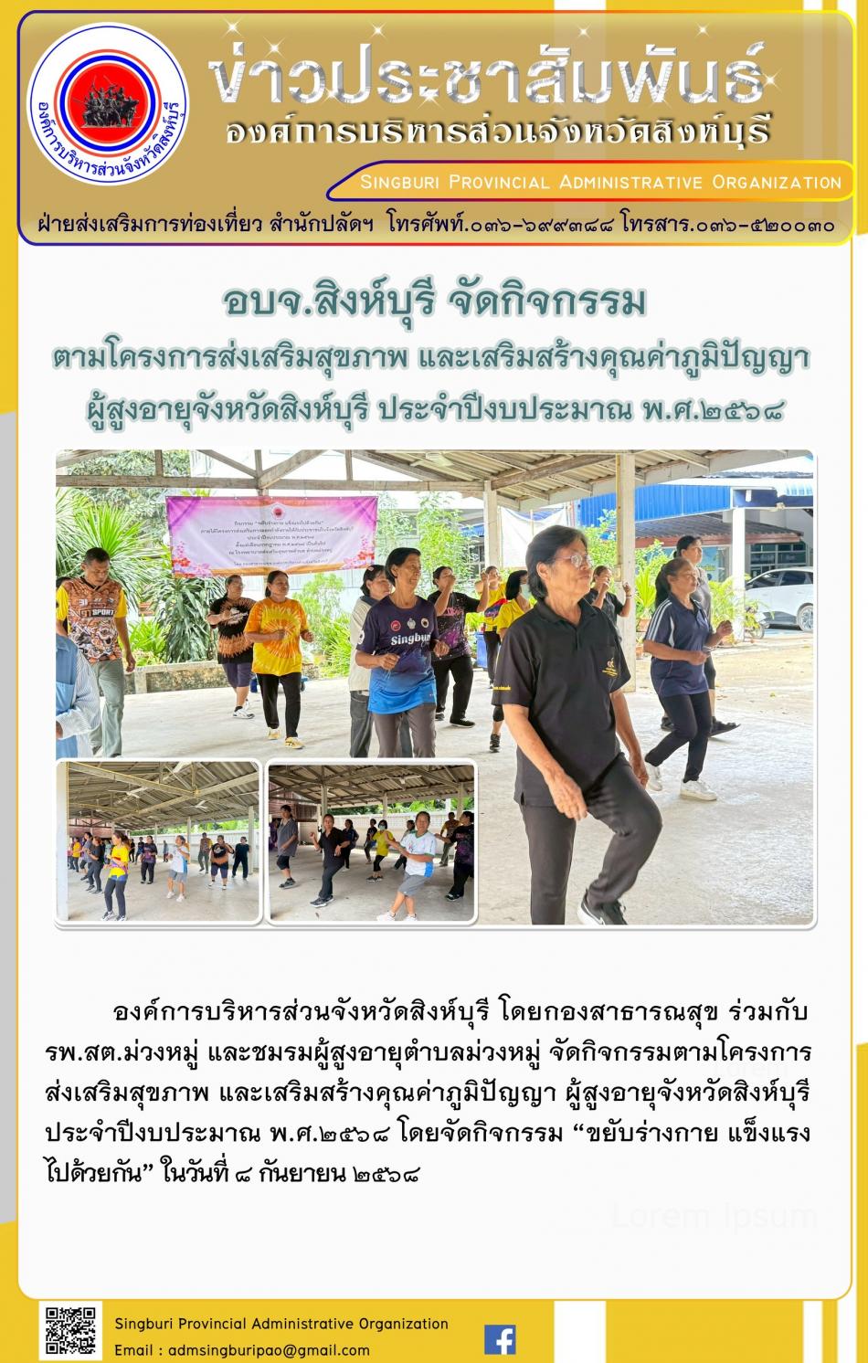 อบจ. สิงห์บุรี จัดกิจกรรมตามโครงการส่งเสริมสุขภาพและ เสริมสร้างคุณค่าภูมิปัญญาผู้สูงอายุจังหวัดสิงห์บุรี ประจำประจำปีงบประมาณ พ. ศ. 2568 [8 กันยายน 2568]