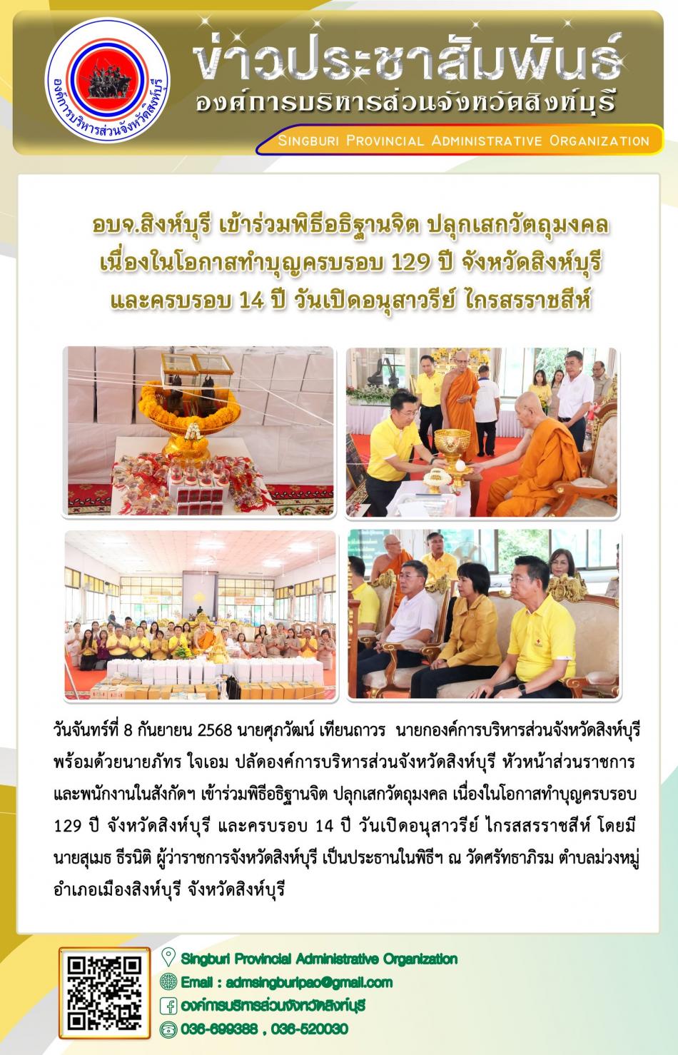 อบจ. สิงห์บุรี เข้าร่วมพิธีอธิษฐานจิต ปลุกเสกวัตถุมงคล เนื่องในโอกาสทำบุญเนื่องในโอกาสทำบุญครบรอบ 129 ปี จังหวัดสิงห์บุรี และครบรอบ 14 ปี วันเปิดอนุสาวรีย์ไกรสรราชสีห์ [8 กันยายน 2568]