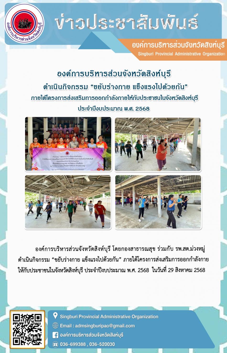 องค์การบริหารส่วนจังหวัดสิงห์บุรี ดำเนินกิจกรรม“ ขยับร่างกาย แข็งแรงไปด้วยกัน” ภายใต้โครงการดำเนินภายใต้โครงการ ส่งเสริมการออกกำลังกาย ส่งเสริมการออกกำลังกายให้กับประชาชนในจังหวัดสิงห์บุรี... [29 สิงหาคม 2568]