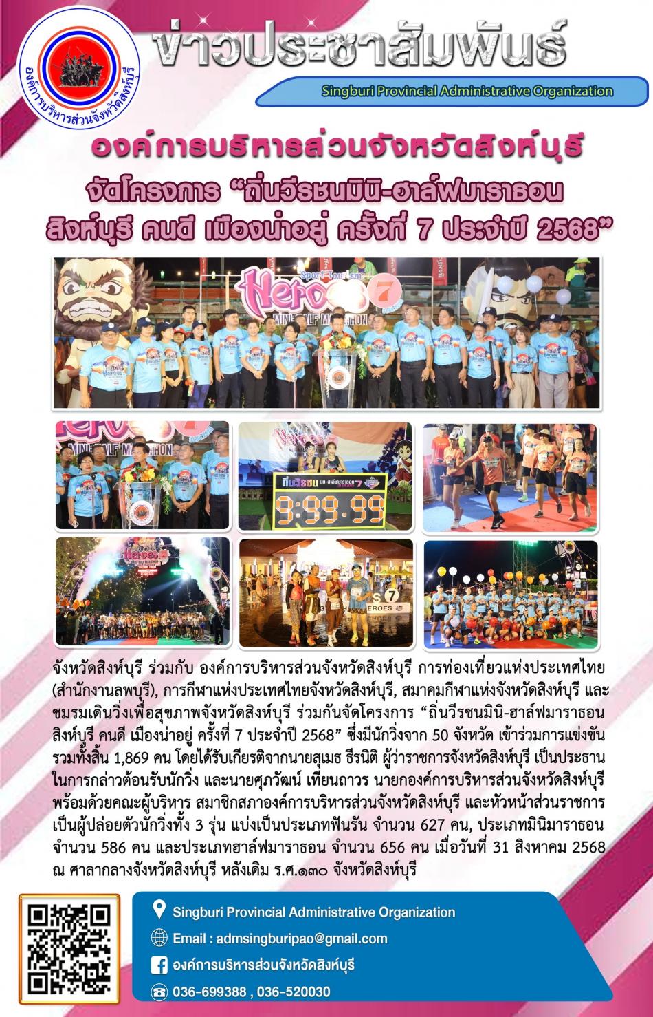 องค์การบริหารส่วนจังหวัดสิงห์บุรี จัดโครงการ“ ถิ่นอยู่ชนมินิ-ฮาล์ฟมาราธอน สิงห์บุรีคนดีเมืองน่าอยู่ครั้งที่เจ็ดประจำสิงห์บุรี คนดี เมืองน่าอยู่ ครั้งที่7ประจำปี 2568 [31 สิงหาคม 2568]