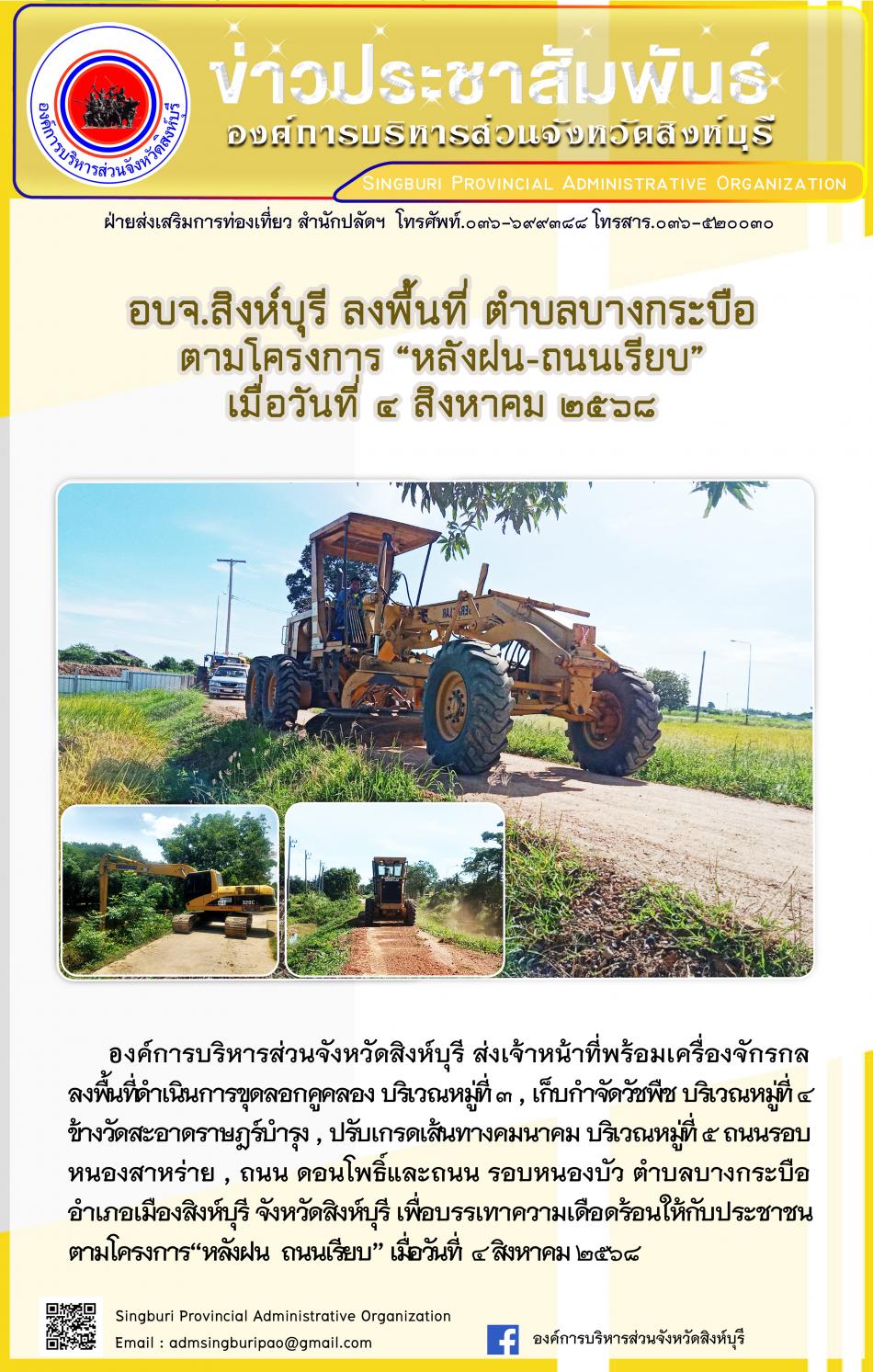 อบจ.สิงห์บุรี ลงพื้นที่ ตำบลบางกระบือ ตามโครงการ "หลังฝน - ถนนเรียบ" [4 สิงหาคม 2568]