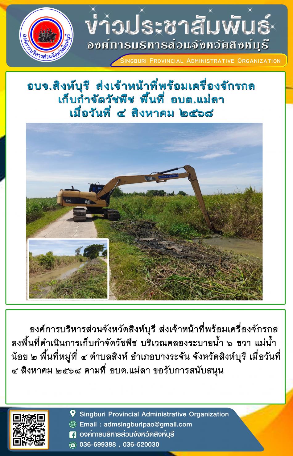 อบจ.สิงห์บุรี ส่งเจ้าหน้าที่พร้อมเครื่องจักรกล เก็บกำจัดวัชพืช พื้นที่ อบต.แม่ลา [4 สิงหาคม 2568]