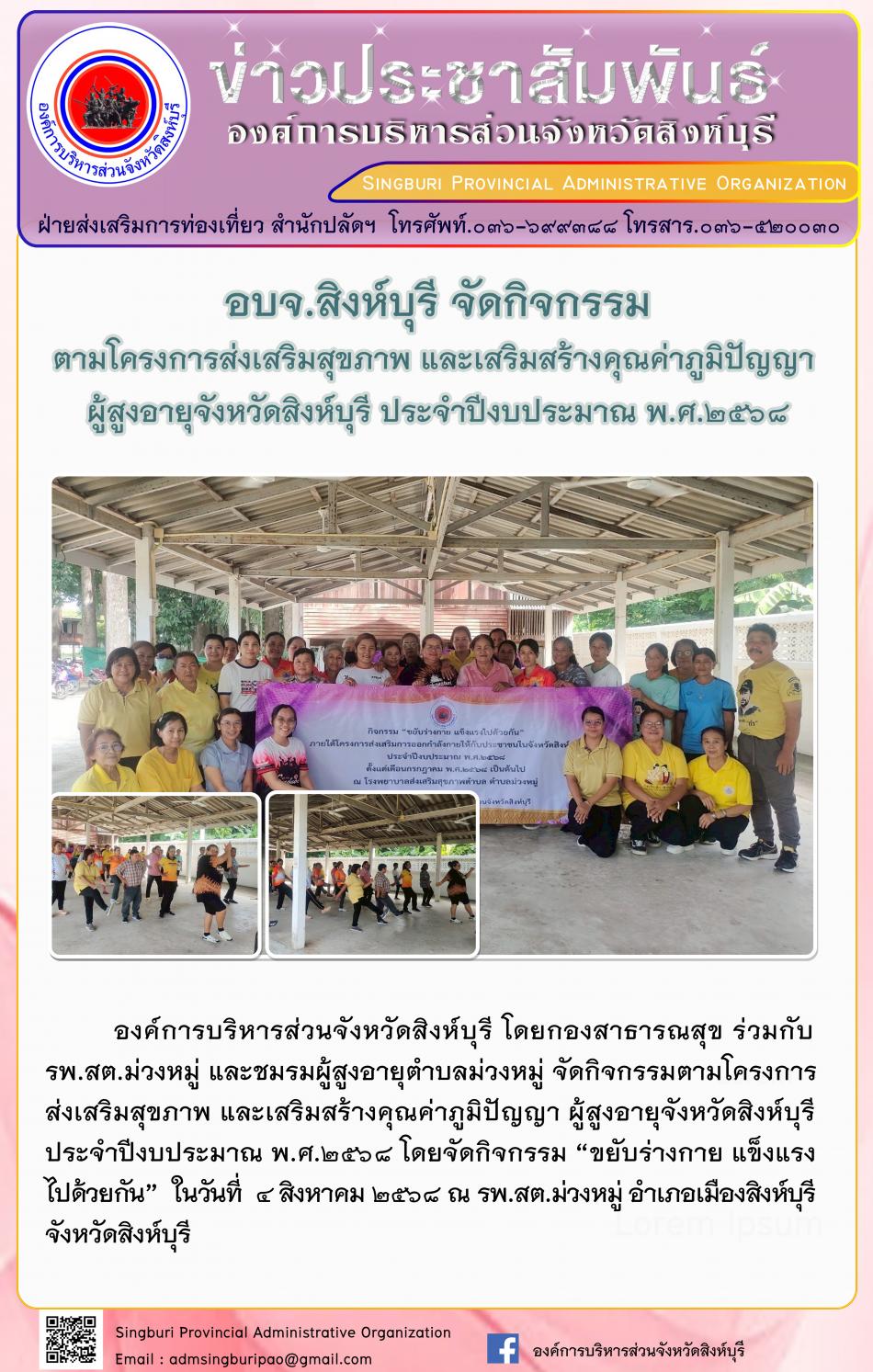 อบจ.สิงห์บุรี จัดกิจกรรมตามโครงการส่งเสริมสุขภาพ และเสริมสร้างคุณค่าภูมิปัญญาผู้สูงอายุจังหวัดสิงห์บุรี ประจำปีงบประมาณ พ.ศ.2568 [4 สิงหาคม 2568]