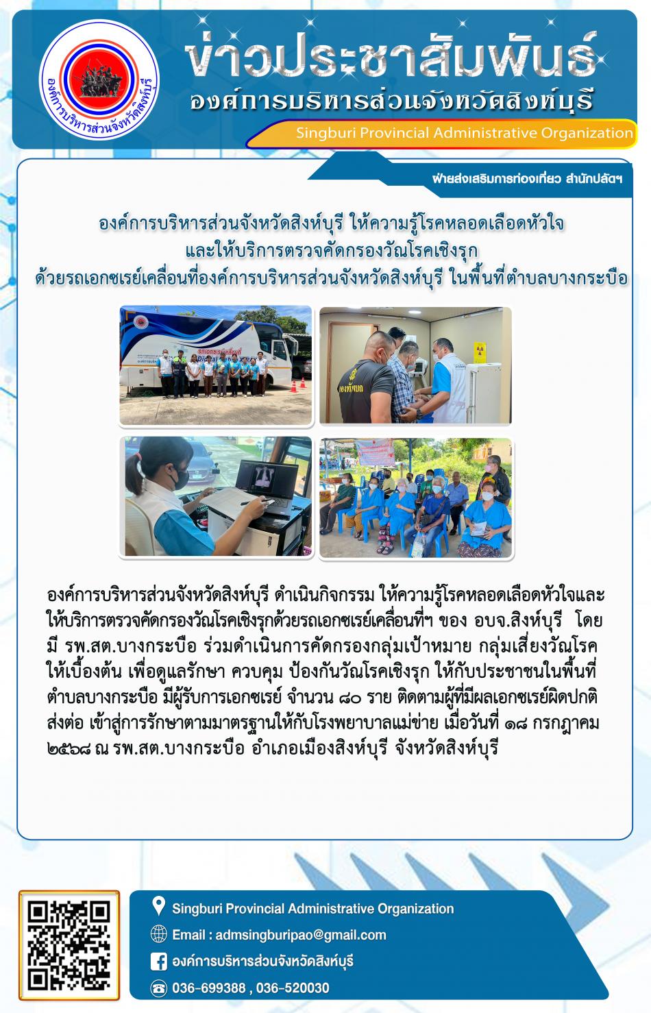 องค์การบริหารส่วนจังหวัดสิงห์บุรี ให้ความรู้โรคหลอดเลือดหัวใจและให้บริการตรวจคัดกรองวัณโรคเชิงรุกด้วยรถเอกซเรย์เคลื่อนที่องค์การบริหารส่วนจังหวัดสิงห์บุรี ในพื้นที่ตำบลบสงกระบือ [18 กรกฎาคม 2568]