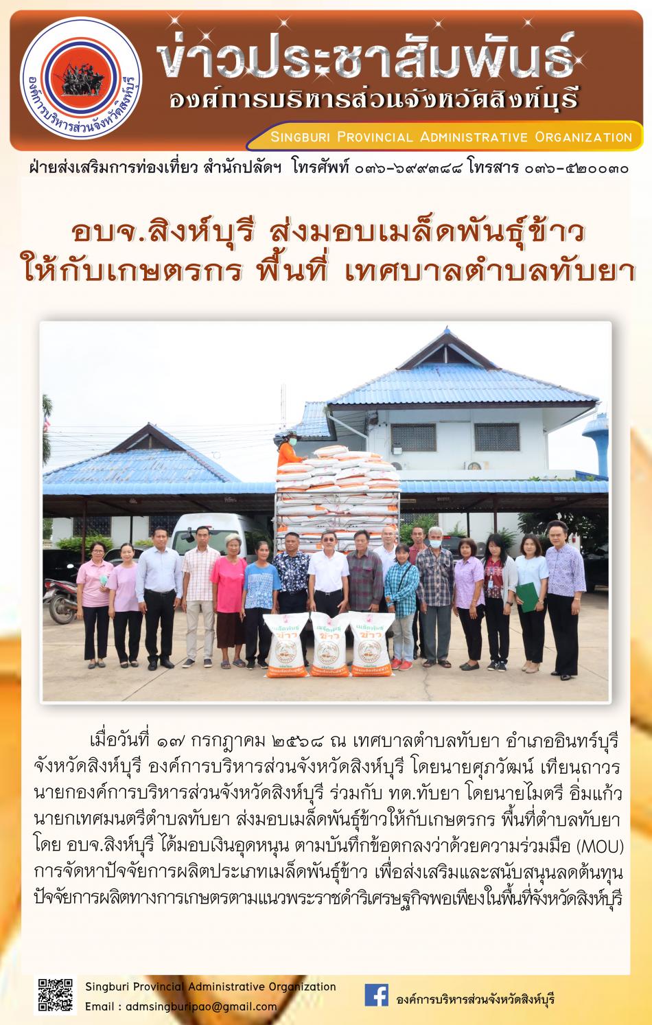 อบจ.สิงห์บุรี ส่งมอบเมล็ดพันธ์ข้าวให้กับเกษตรกร พื้นที่เทศบาลตำบลทับยา [17 กรกฎาคม 2568]