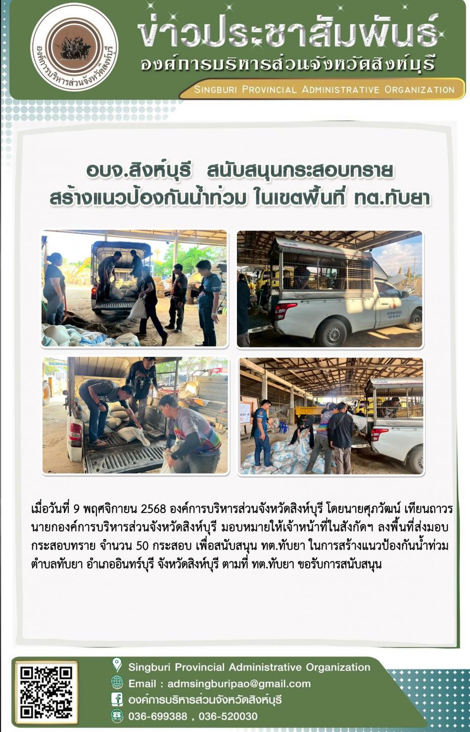 อบจ.สิงห์บุรี สนับสนุนกระสอบทราย สร้างแนวป้องกันน้ำท่วม ในเขตพื้นที่ ทต.ทับยา [9 พฤศจิกายน 2568]