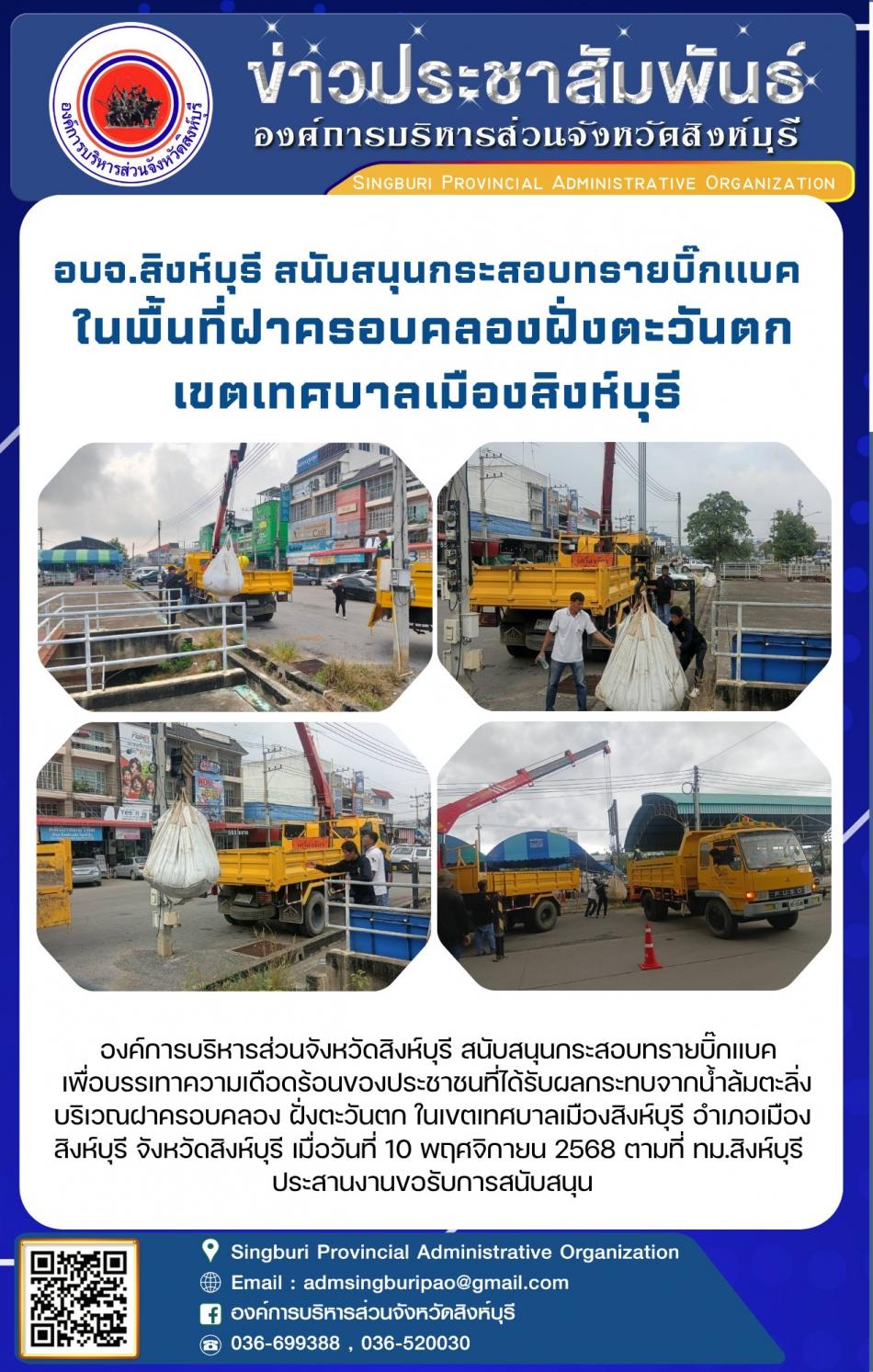 อบจ.สิงห์บุรี สนับสนุนกระสอบทราบบิ๊กแบค ในเขตพื้นที่ฝาครอบครองฝั่งตะวันตก เขตเทศบาลเมืองสิงห์บุรี [10 พฤศจิกายน 2568]