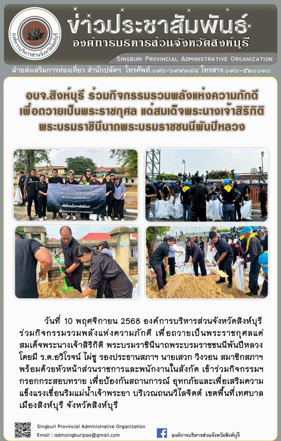 องค์การบริหารส่วนจังหวัดสิงห์บุรี กรอกกระสอบทราย เดื่อเตรียมความพร้อม รับสถานการณ์อุทกภัย [10 พฤศจิกายน 2568]