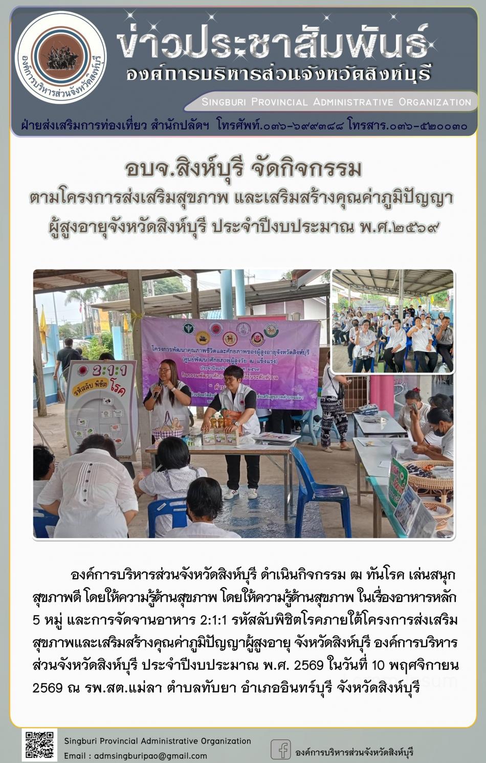 อบจ.สิงห์บุรี จัดกิจกรรม ตามโครงการส่งเสริมสุขภาพ และเสริมสร้างคุณค่าภูมิปัญญาผู้สูงอายุจังหวัดสิงห์บุรี ประจำปีงบประมาณพ.ศ. 2569 [10 พฤศจิกายน 2568]