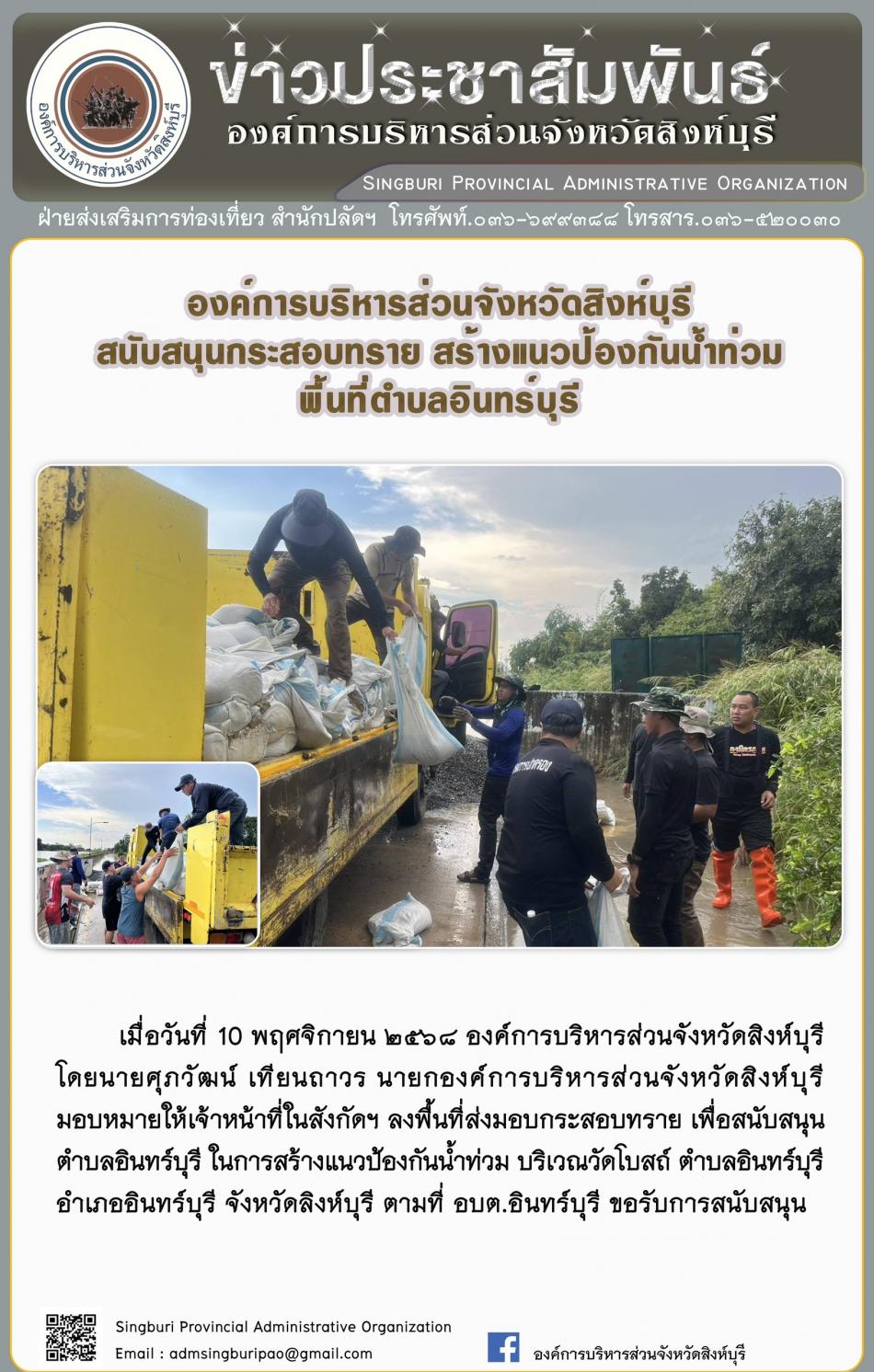 องค์การบริหารส่วนจังหวัดสิงห์บุรี สนับสนุนกระสอบทราย สร้างแนวป้องกันน้ำท่วม พื้นที่ตำบลอินทร์บุรี [10 พฤศจิกายน 2568]