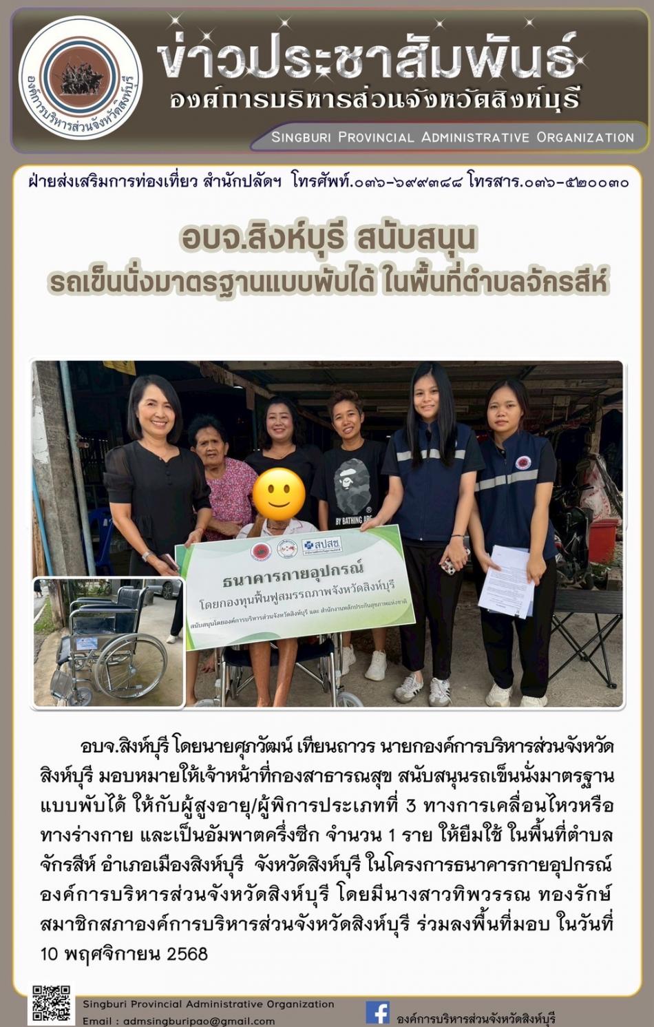 อบจ.สิงห์บุรี สนับสนุนรถเข็นนั่งแบบมาตรฐานพับได้ ในพื้นที่ตำบลจักรสีห์ [10 พฤศจิกายน 2568]