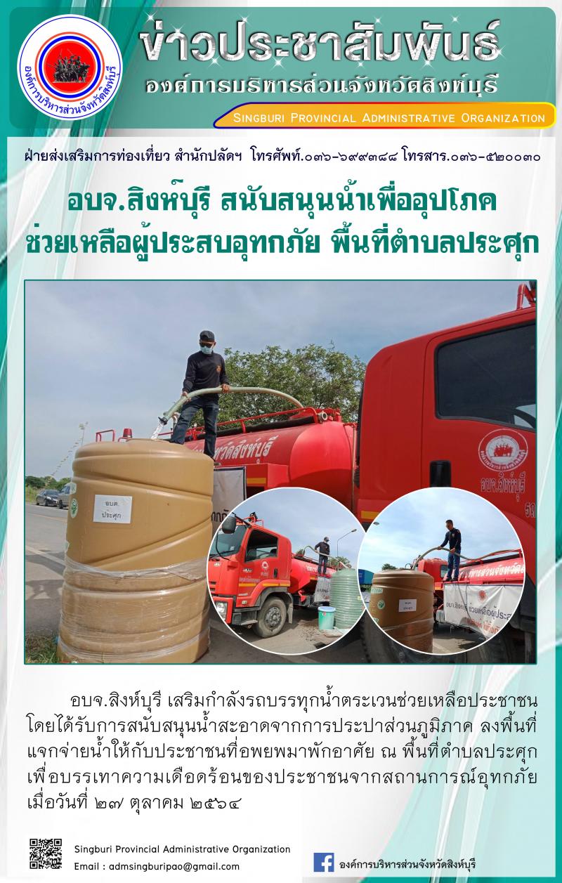 อบจ.สิงห์บุรี ลงพื้นที่สนับสนุนน้ำเพื่ออุปโภคบริโภค ช่วยเหลือผู้ประสบอุทกภัย พื้นที่ตำบลชีน้ำร้าย และตำบลน้ำตาล