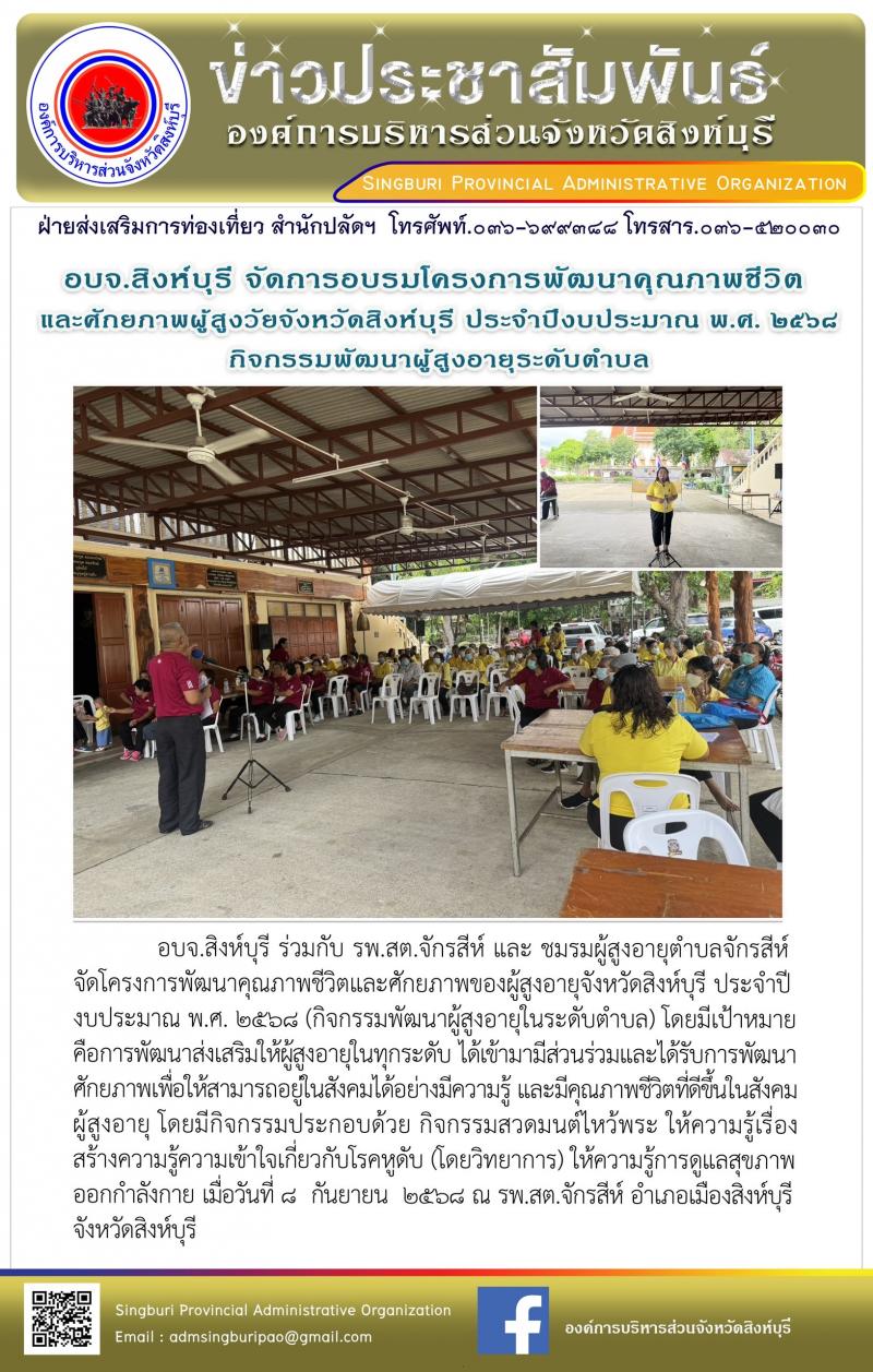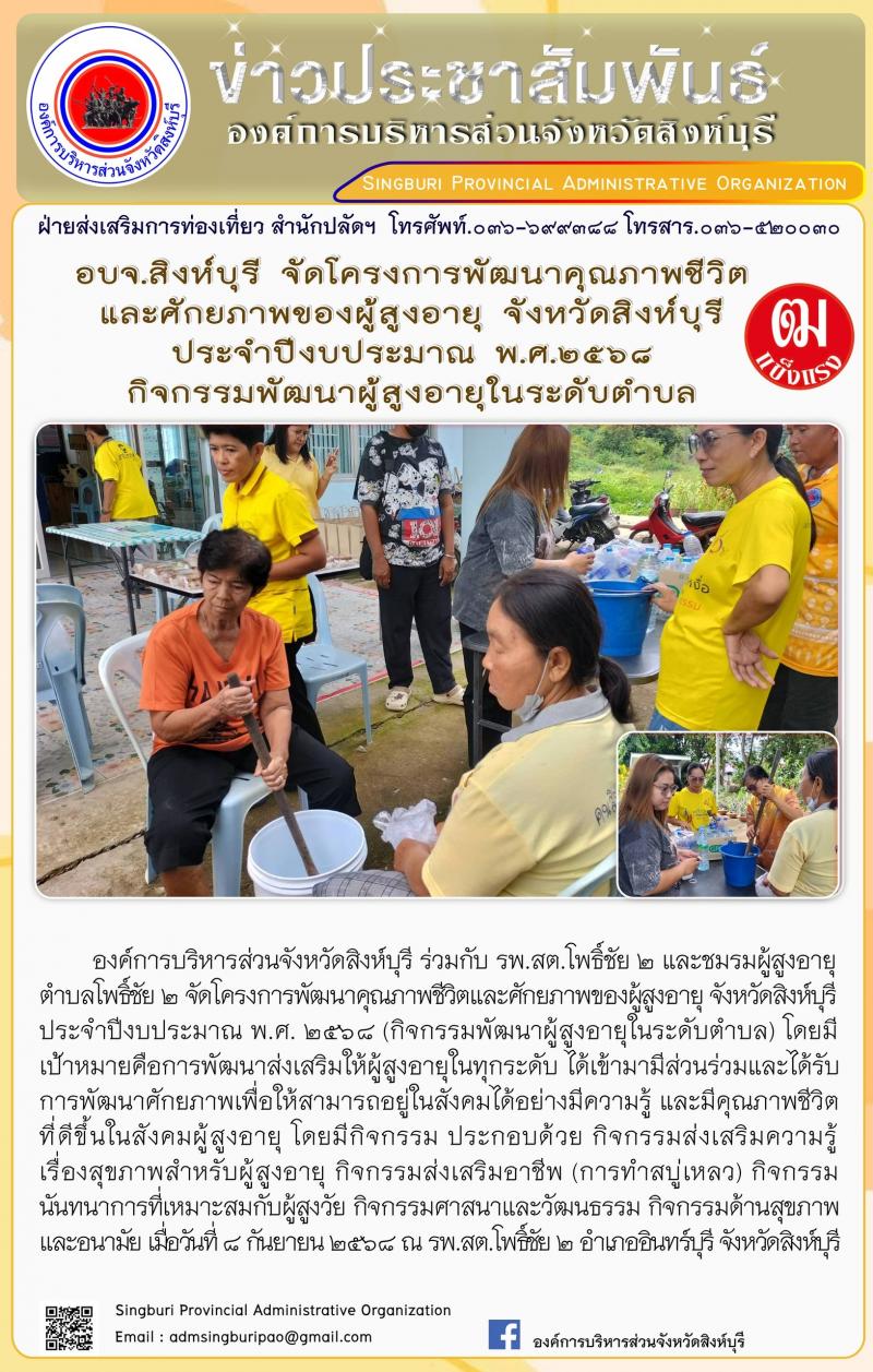 อบจ. สิงห์บุรี จัดโครงการพัฒนาคุณภาพชีวิตและศักยภาพของผู้สูงอายุ จังหวัด สิงห์บุรี ประจำประจำปีงบประมาณปี พ. ศ. 2568 กิจกรรมพัฒนาผู้สูงอายุในระดับตำบลกิจกรรมพัฒนาผู้สูงอายุในระดับตำบล