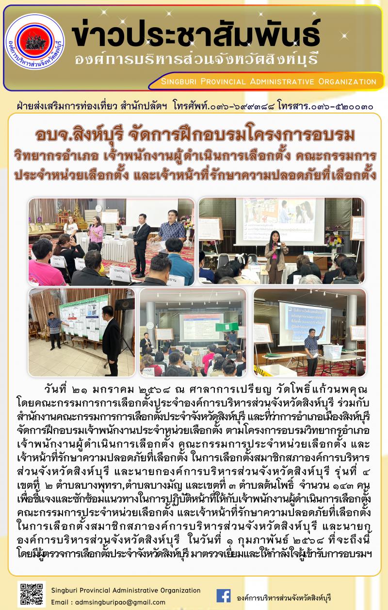 อบจ.สิงห์บุรี จัดการฝึกอบรมโครงการอบรมวิทยากรอำเภอ เจ้าพนักงานดำเนินการเลือกตั้ง คณะกรรมการประจำหน่วยเลือกตั้ง และเจ้าหน้าที่รักษาความปลอดภัยที่เลือกตั้ง