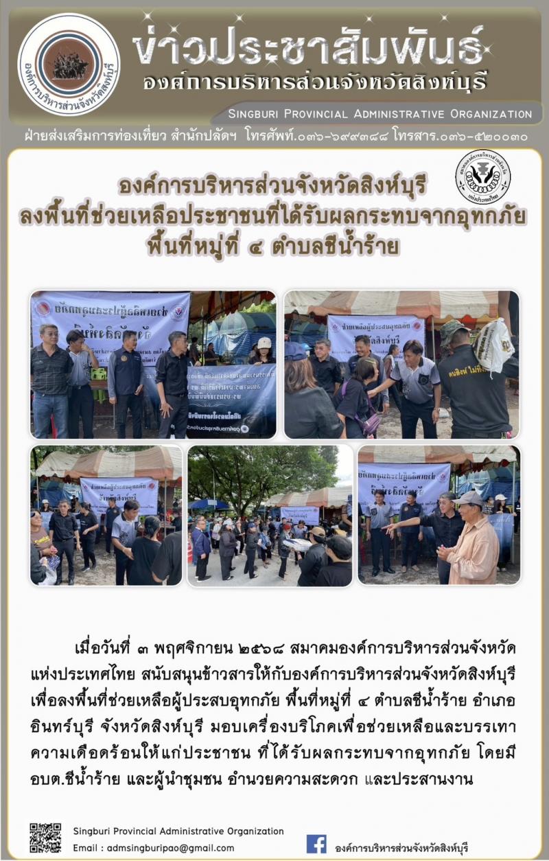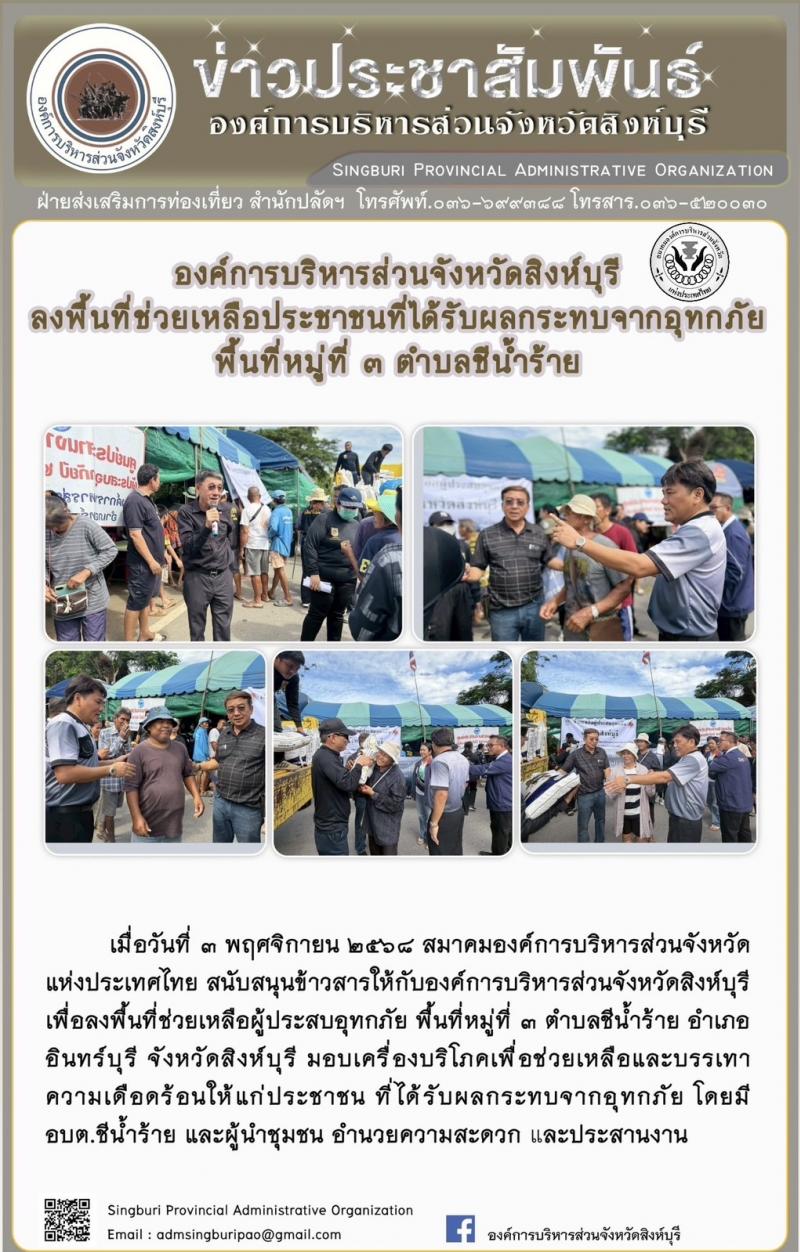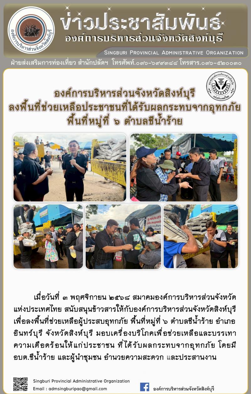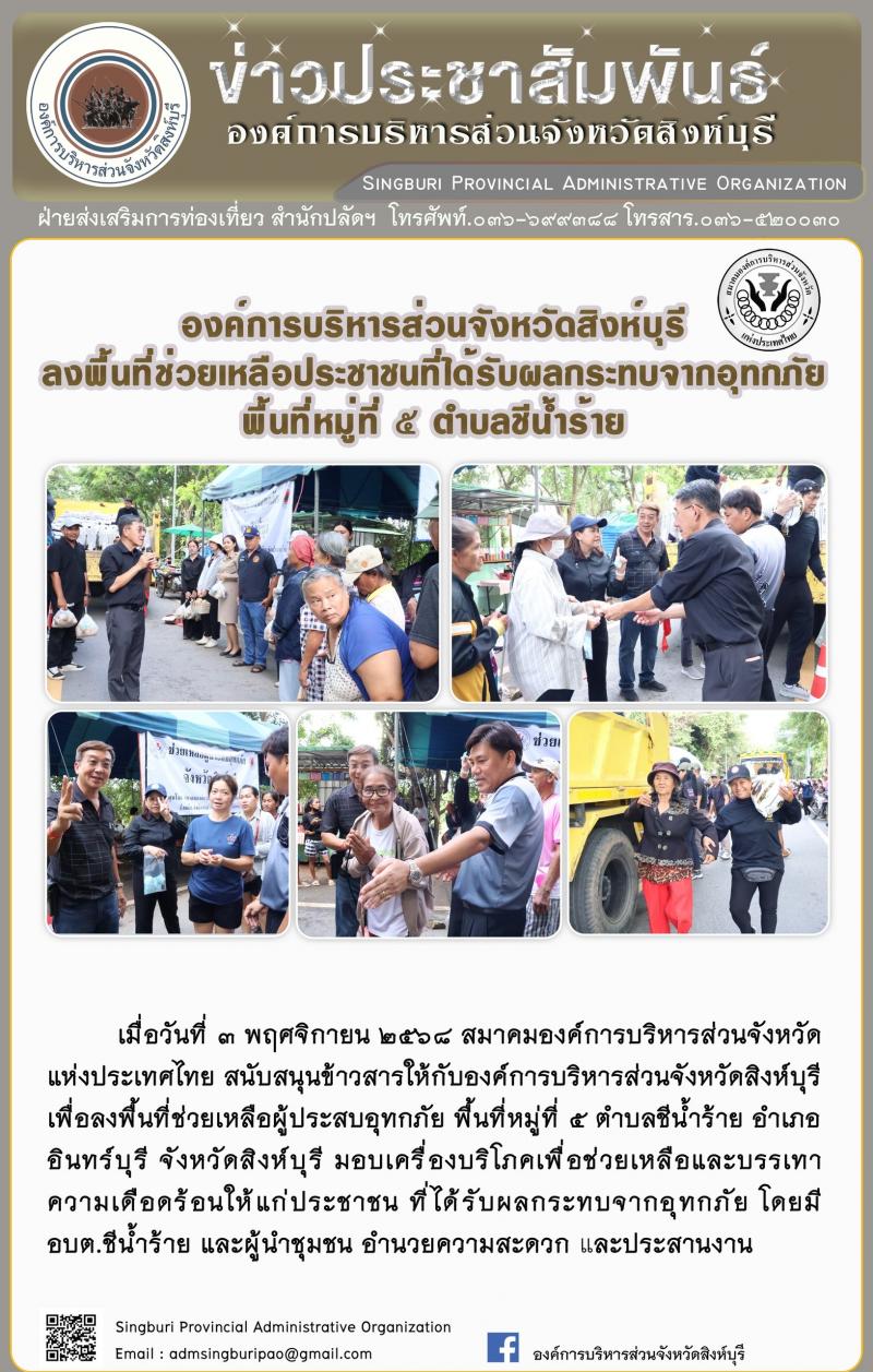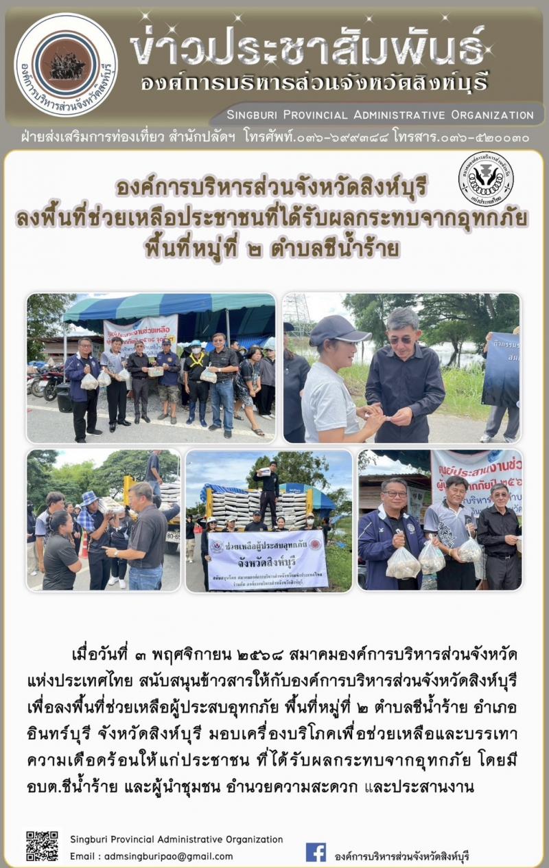 องค์การบริหารส่วนจังหวัดสิงห์บุรี ลงพื้นที่ช่วยเหลือ ประชาชนที่ได้รับผลกระทบจากอุทกภัย พื้นที่ตำบลชีน้ำร้าย