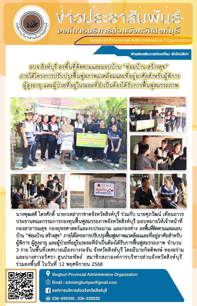 อบจ.สิงห์บุรี ลงพื้นที่ติดตามและมอบบ้าน "ซ่อมบ้าน สร้างสุข" ภายใต้โครงการปรับปรุงฟื้นฟูสภาพแวดล้อมและที่อยู่อาศัยสำหรับผู้พิการผู้สูงอายุ และผู้ป่วยที่อยู่ในระยะที่จำเป็นต้องได้รับการฟื้นฟูสมรรถภาพ