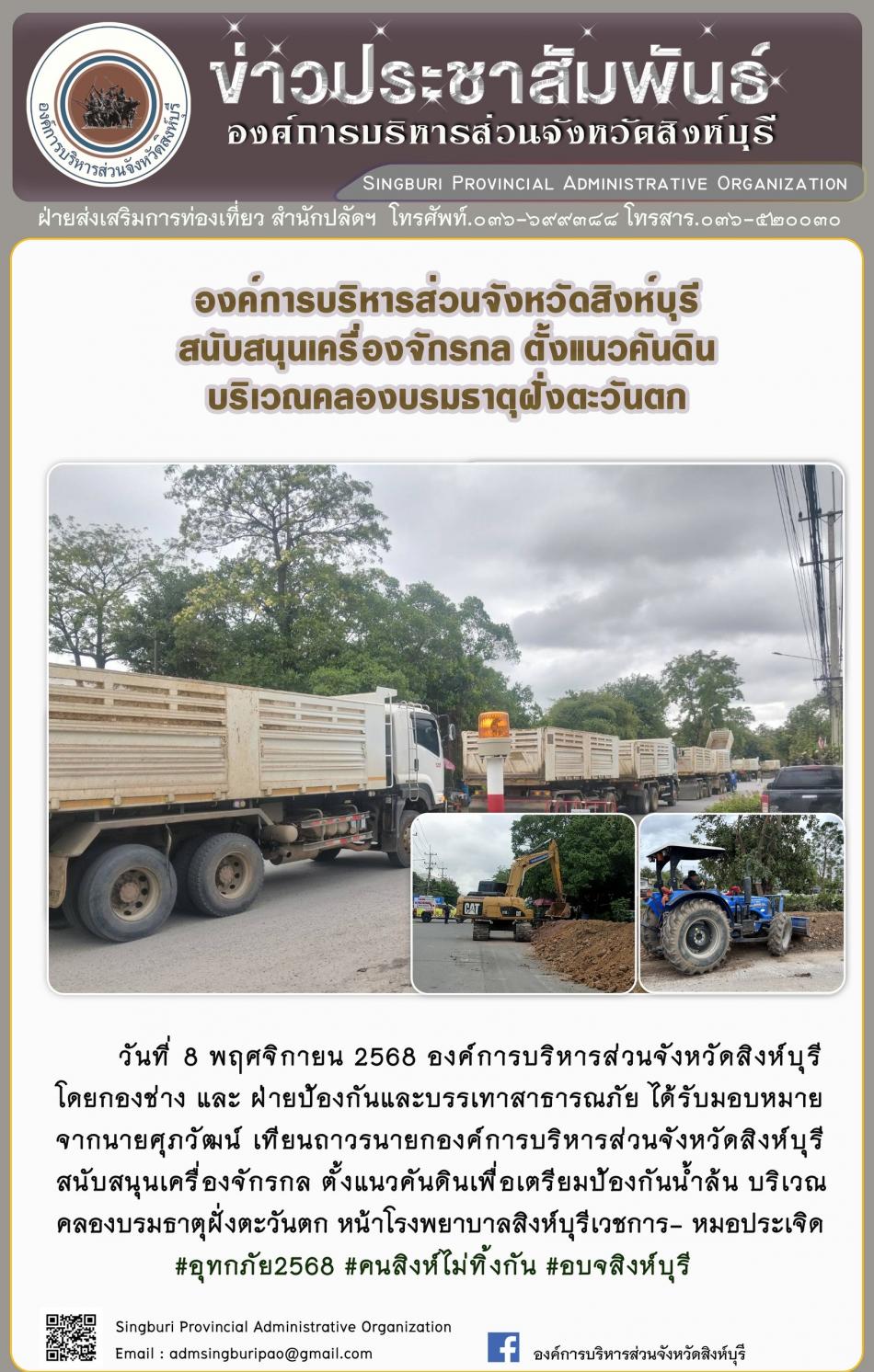 อบจ.สิงห์บุรี ส่งเจ้าหน้าที่พร้อมเครื่องจักรกล ลงพื้นที่ตั้งแนวคันดินป้องกันน้ำล้นลงพื้นที่ตั้งแนวคันดินป้องกันน้ำล้น พื้นที่ อบต บ้านหมอ้ [7 พฤศจิกายน 2568]