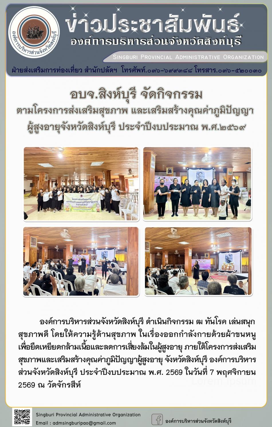 อบจ.สิงห์บุรี จัดกิจกรรมตามโครงการส่งเสริมสุขภาพ และเสริมสร้างคุณค่าภูมิปัญญาผู้สูงอายุ ประจำปีงบประมาณ พ.ศ.2568 [7 พฤศจิกายน 2568]