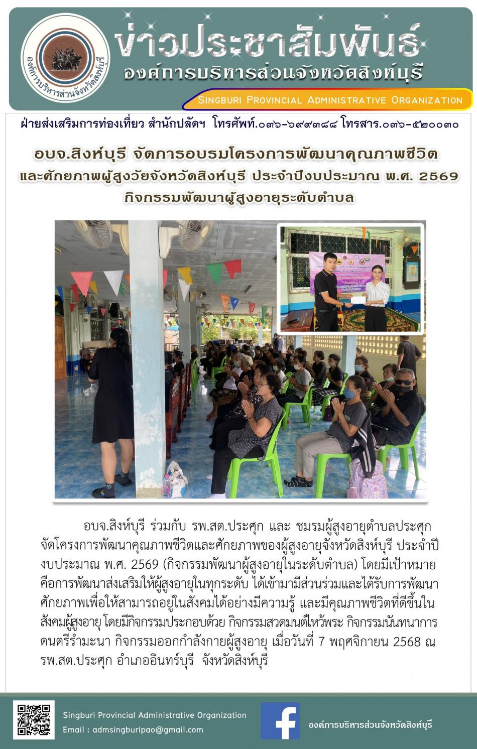 อบจ. สิงห์บุรี จัดโครงการพัฒนาคุณภาพชีวิตและศักยภาพของผู้สูงอายุ จังหวัด สิงห์บุรี ประจำประจำปีงบประมาณปี พ. ศ. 2569 กิจกรรมพัฒนาผู้สูงอายุในระดับตำบลกิจกรรมพัฒนาผู้สูงอายุในระดับตำบล [7 พฤศจิกายน 2568]