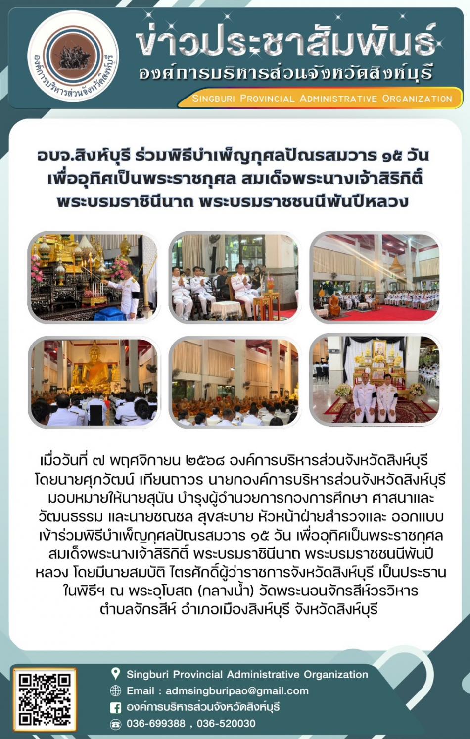 อบจ.สิงห์บุรี ร่วมพิธีบำเพ็ญกุศิลปัณรสมวาร 15 วัน เพื่ออุทิศเป็นพระราชกุศล สมเด็จพระนางเจ้าสิริกิติ์พระบรมราชินีนาถ พระบรมราชชนนีพันปีหลวง [7 พฤศจิกายน 2568]