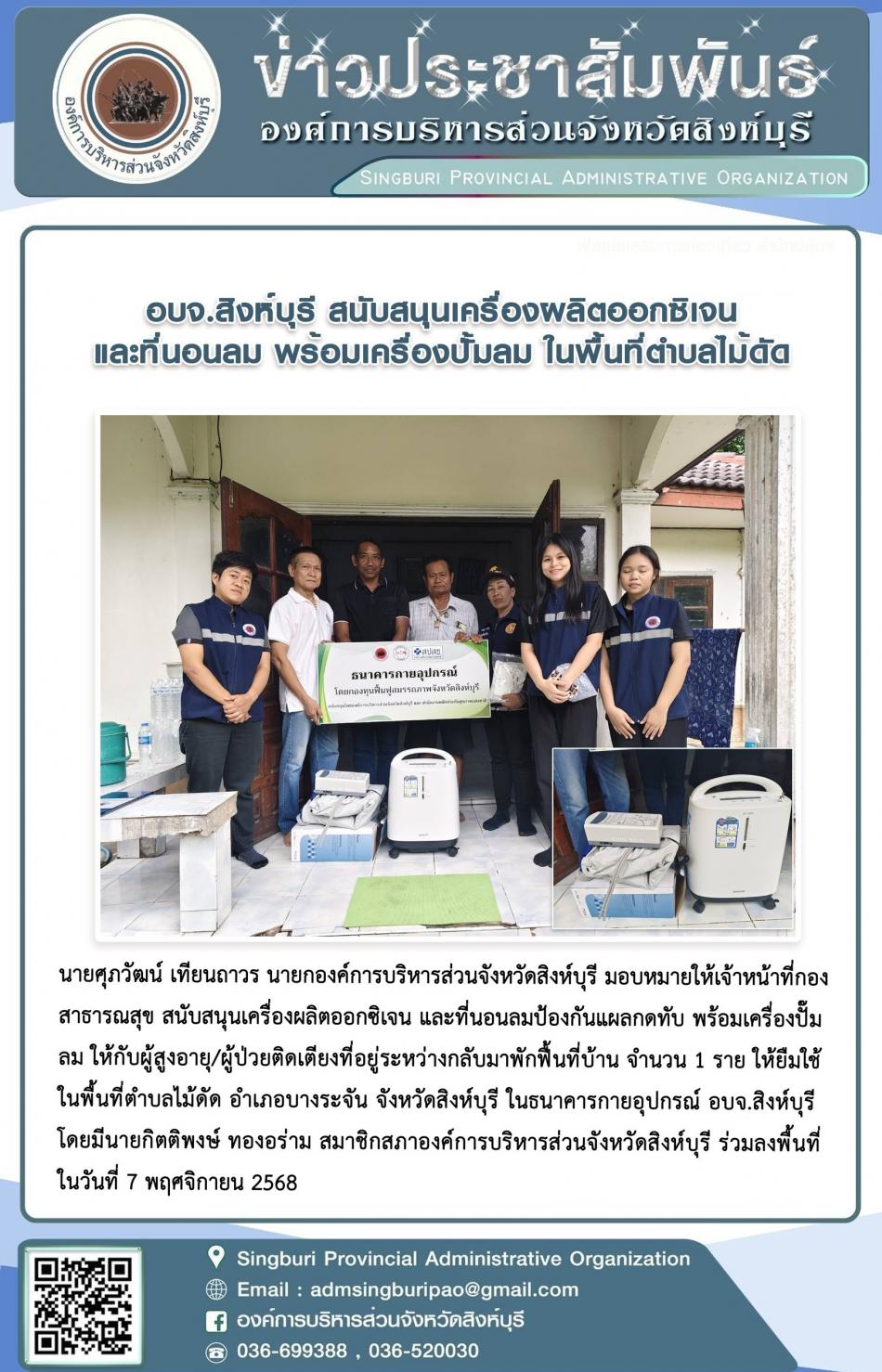 อบจ.สิงห์บุรี สนับสนุนเครื่องผลิตออกซิเจน และที่นอนลม พร้อมเครื่องปั๊ม ในพื้นที่ตำบลไม้ดัด [7 พฤศจิกายน 2568]