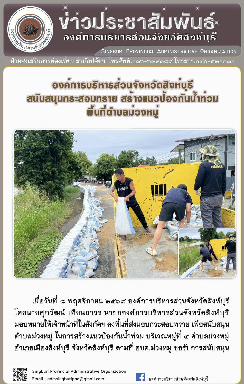 องค์การบริหารส่วนจังหวัดสิงห์บุรี สนับสนุนกระสอบทรายสร้างเนื้อป้องกันน้ำท่วม พื้นที่ตำบลม่วงหมู่ [8 พฤศจิกายน 2568]