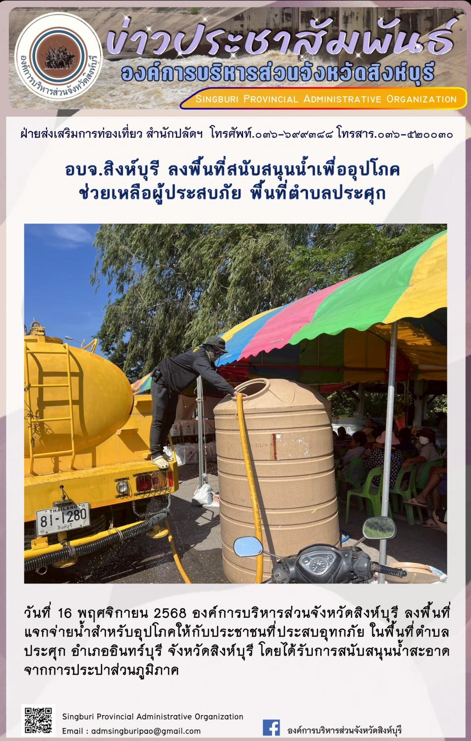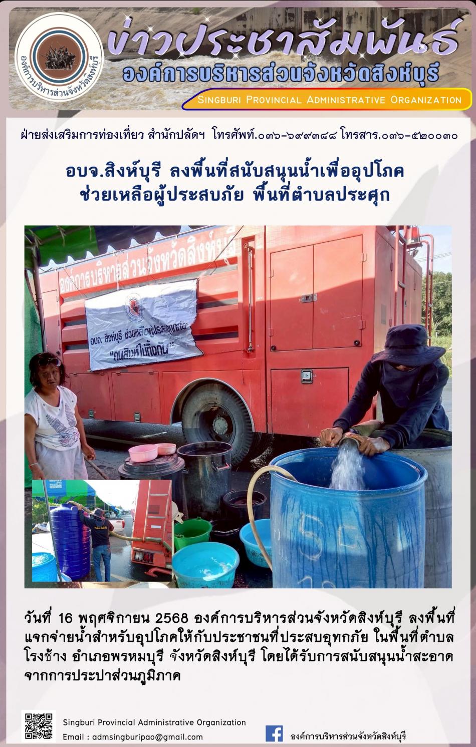 อบจ.สิงห์บุรี ลงพื้นที่สนับสนุนน้ำเพื่ออุปโภค ช่วยเหลือผู้ประสบอุทกภัย พื้นที่ตำบลประศุก [16 พฤศจิกายน 2568]