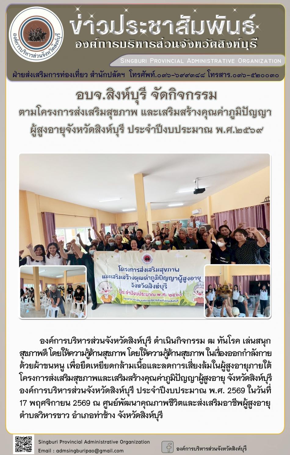 อบจ.สิงห์บุรี จัดกิจกรรม ตามโครงการส่งเสริมสุขภาพ และเสริมสร้างคุณค่าภูมิปัญญาผู้สูงอายุจังหวัดสิงห์บุรี ประจำปีงบประมาณพ.ศ. 2500 [17 พฤศจิกายน 2568]