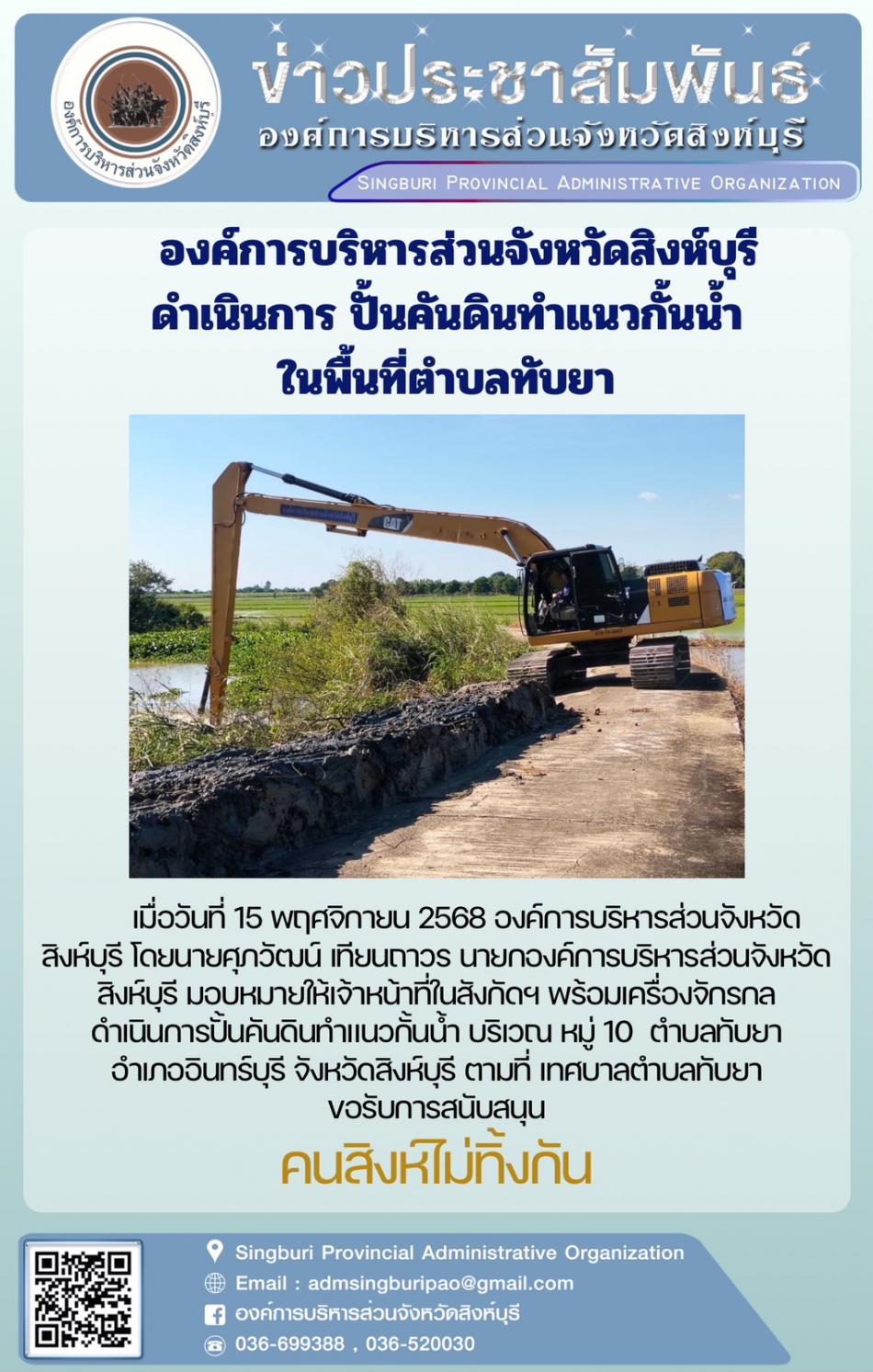 องค์การบริหารส่วนจังหวัดสิงห์บุรี ดำเนินการปั้นดันดินทำแนวกั้นน้ำ ในพื้นที่ตำบลทับยา [15 พฤศจิกายน 2568]