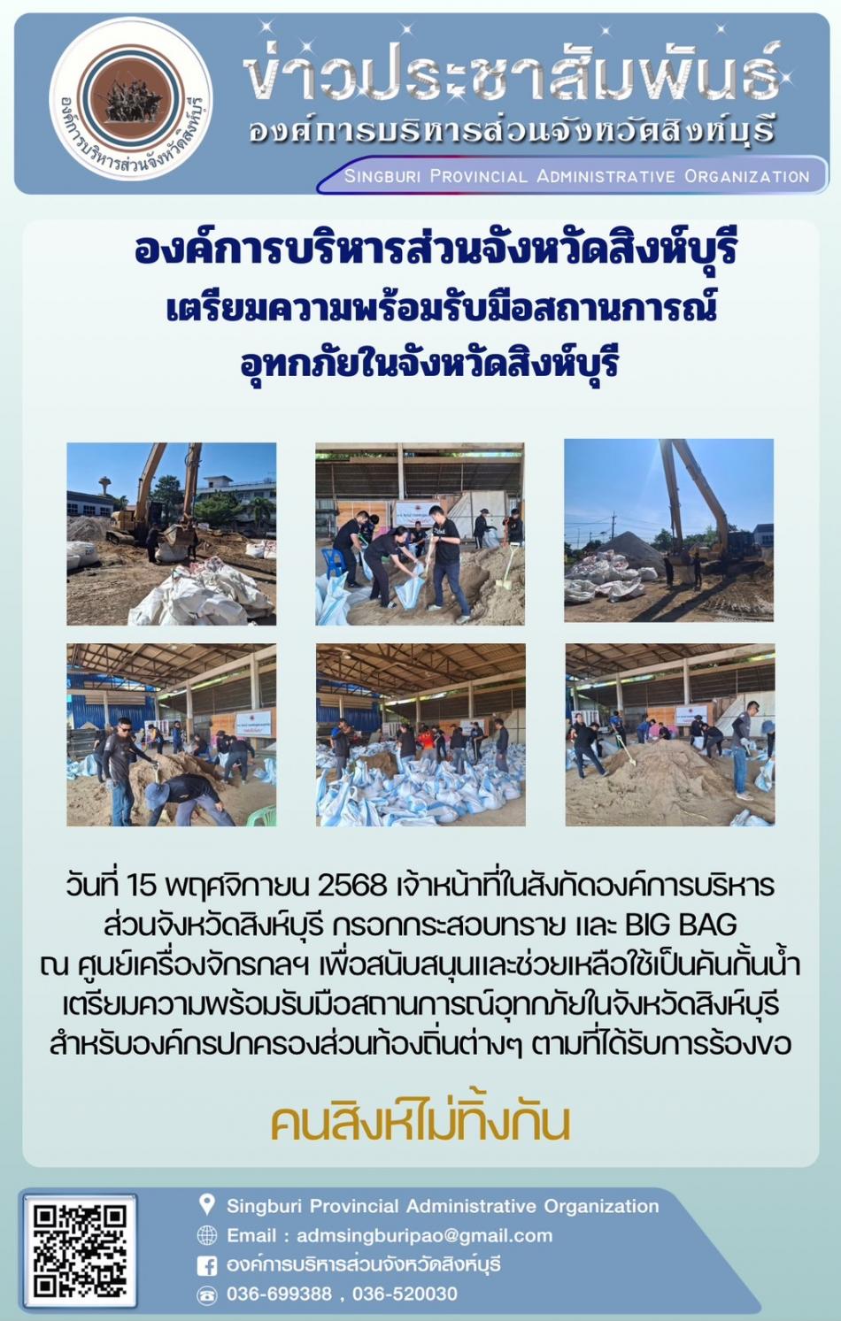 องค์การบริหารส่วนจังหวัดสิงห์บุรี เตรียมความพร้อมรับมือสถานการณ์ อุทกภัยในจังหวัดสิงห์บุรี [15 พฤศจิกายน 2568]