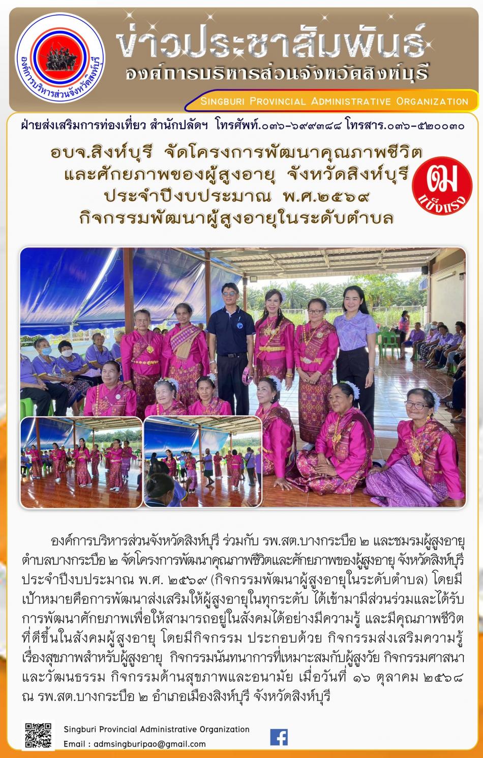 อบจ.สิงห์บุรี จัดโครงการพัฒนาคุณภาพชีวิตและศักยภาพของผู้สูงอายุ จังหวัดสิงห์บุรี ประจำปีงบประมาณ พ.ศ. 2569 กิจกรรมพัฒนาผู้สูงอายุระดับตำบล [16 ตุลาคม 2568]