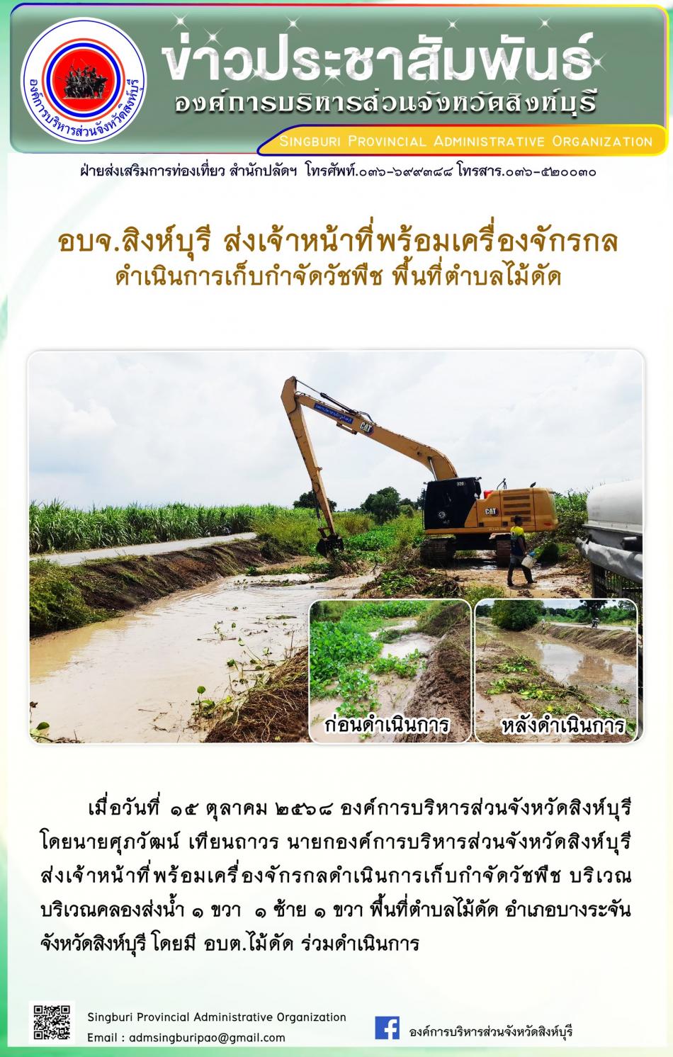 อบจ.สิงห์บุรี ส่งเจ้าหน้าที่พร้อมเครื่องจักรกล ดำเนินการเก็บกำจัดวัชพืช พื้นที่ตำบลไม้ดัด [15 ตุลาคม 2568]