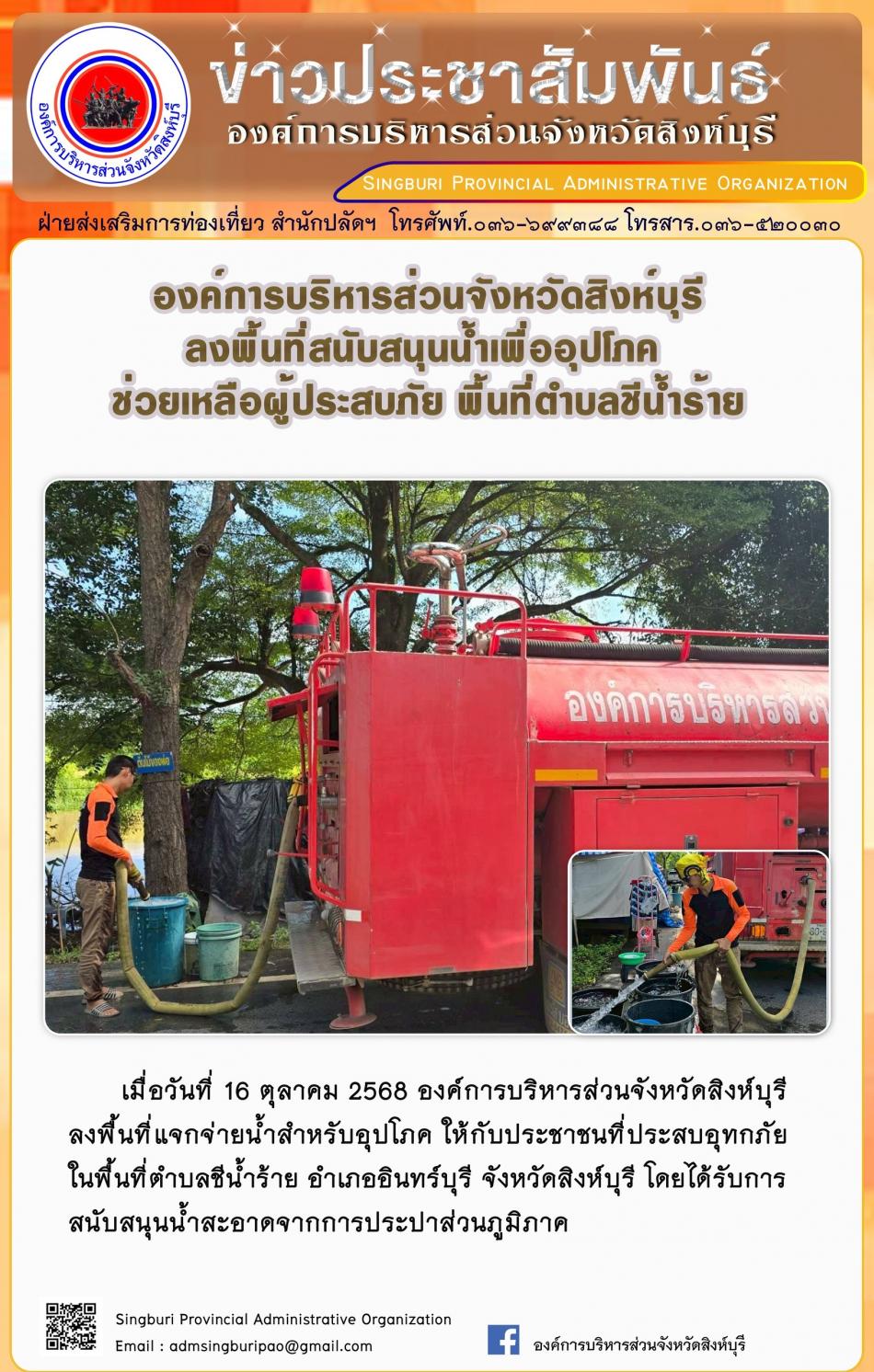 องค์การบริหารส่วนจังหวัดสิงห์บุรี ลงพื้นที่สนับสนุนน้ำเพื่ออุปโภค ช่วยเหลือผู้ประสบภัย พื้นที่ตำบลชีน้ำร้าย [16 ตุลาคม 2568]