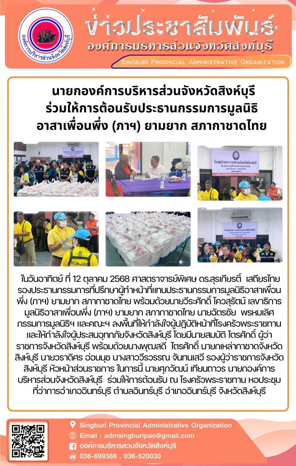 นายกองค์การบริหารส่วนจังหวัดสิงห์บุรีร่วมให้การต้อนรับประธานกรรมการมูลนิธิอาราเพื่อนนึ่ง (ภา) ยามยากสภากาชาดโทย [12 ตุลาคม 2568]