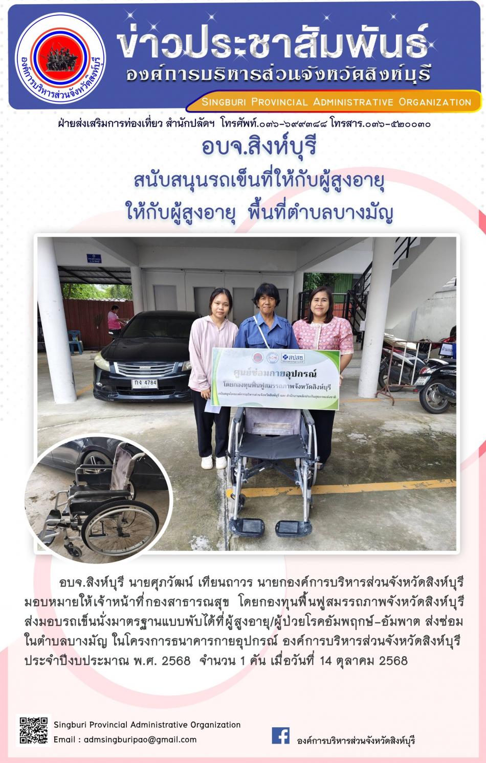 อบจ.สิงห์บุรี สนับสนุนรถเข็นที่ให้กับผู้สูงอายุให้กับผู้สูงอายุ พื้นที่ตำบลบางมัญ [14 ตุลาคม 2568]