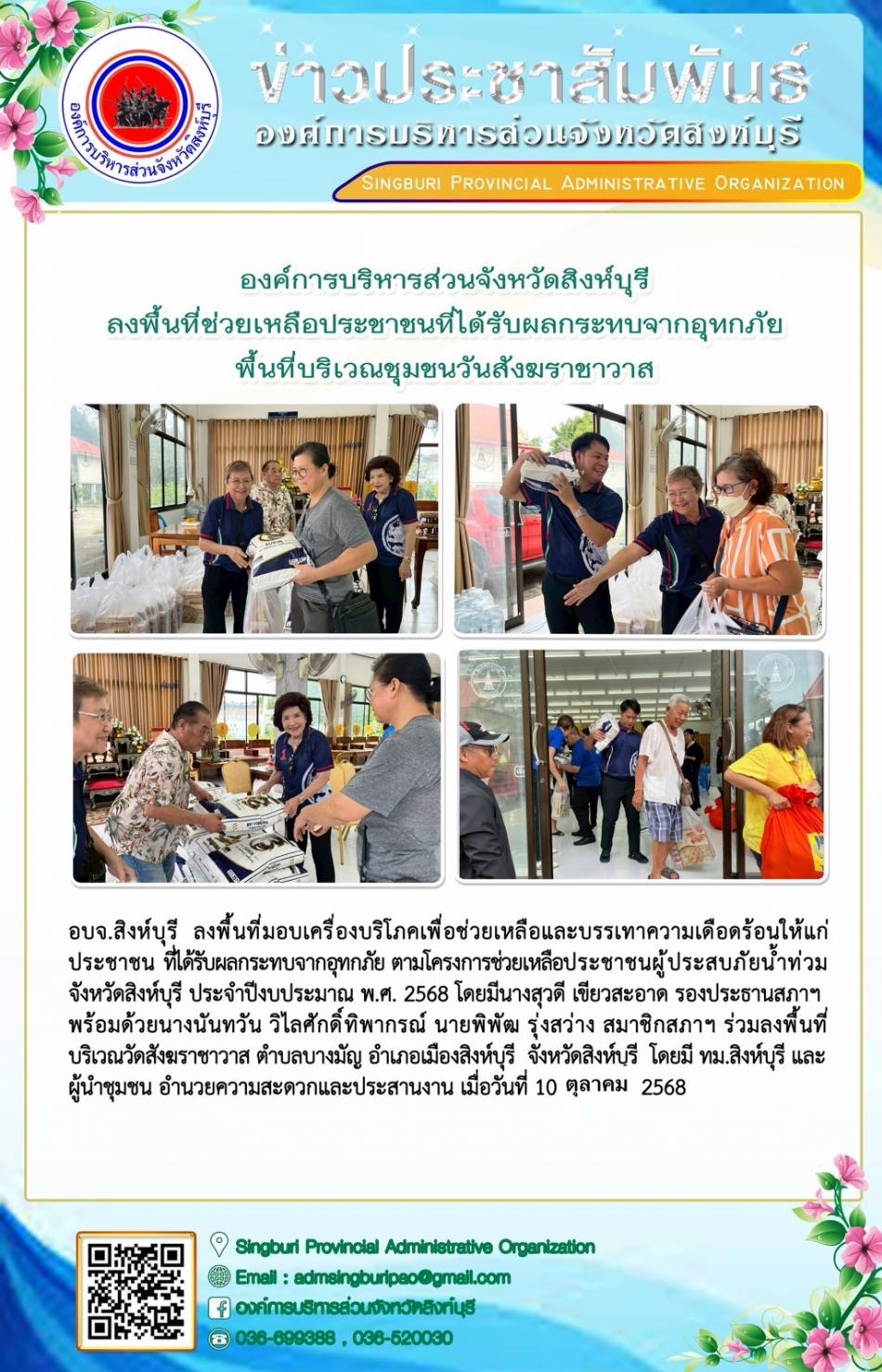 องค์การบริหารส่วนจังหวัดสิงห์บุรี ลงพื้นที่ช่วยเหลือประชาชนที่ได้รับผลกระทบจากอุทกภัย พื้นที่บริเวณชุมชนวัดสังฆราชาวาส [10 ตุลาคม 2568]