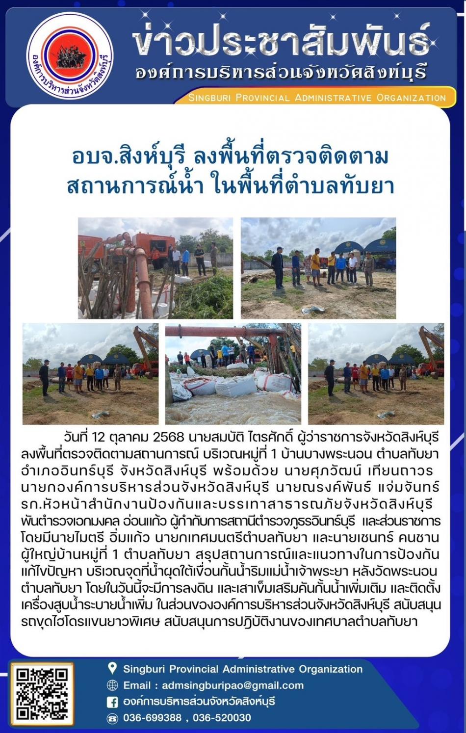 อบจ.สิงห์บุรี ลงพื้นที่ตรวจติดตามสถานการณ์น้ำ ในพื้นที่ตำบลทับยา [12 ตุลาคม 2568]